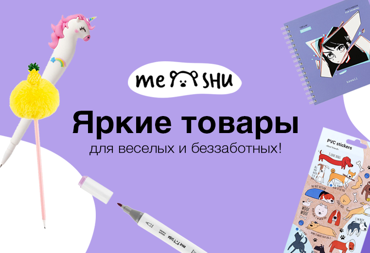 MESHU – это бренд ярких мелочей для хорошего настроения.В его ассортименте вы найдете канцелярские товары с оригинальным и привлекательным дизайном – блокноты, ручки, тетради, закладки, ластики, планеры и т.д.