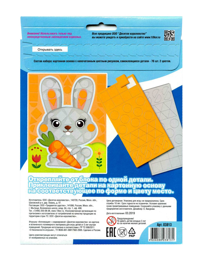 Аппликация «Зайчик» — это простой и увлекательный способ создать яркий тематический рисунок. Набор разработан так, чтобы ребенок мог легко освоить технику работы с деталями, развивая при этом мелкую моторику, щипковый захват и логическое мышление. Процесс приклеивания элементов на основу знакомит малыша с основными цветами и геометрическими формами в игровой форме.