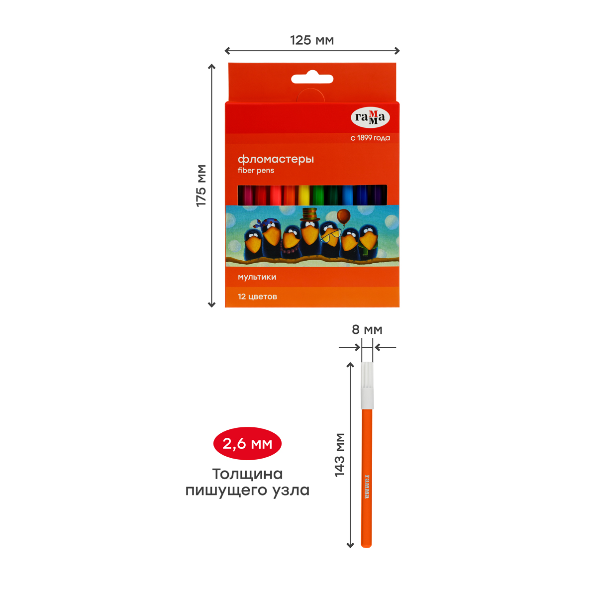 Фломастеры ГАММА серии «Мультики» созданы для комфортного детского творчества. В наборе 12 насыщенных цветов: чёрный, коричневый, розовый, красный, оранжевый, жёлтый, салатовый, зелёный, голубой, синий, тёмно-синий, фиолетовый. Тип наконечника – конический. Толщина пишущего узла – 2,6 мм позволяет наносить как тонкие, так и толстые линии для создания ярких рисунков. Чернила на основе воды и пищевых красителей легко смываются с одежды и рук.