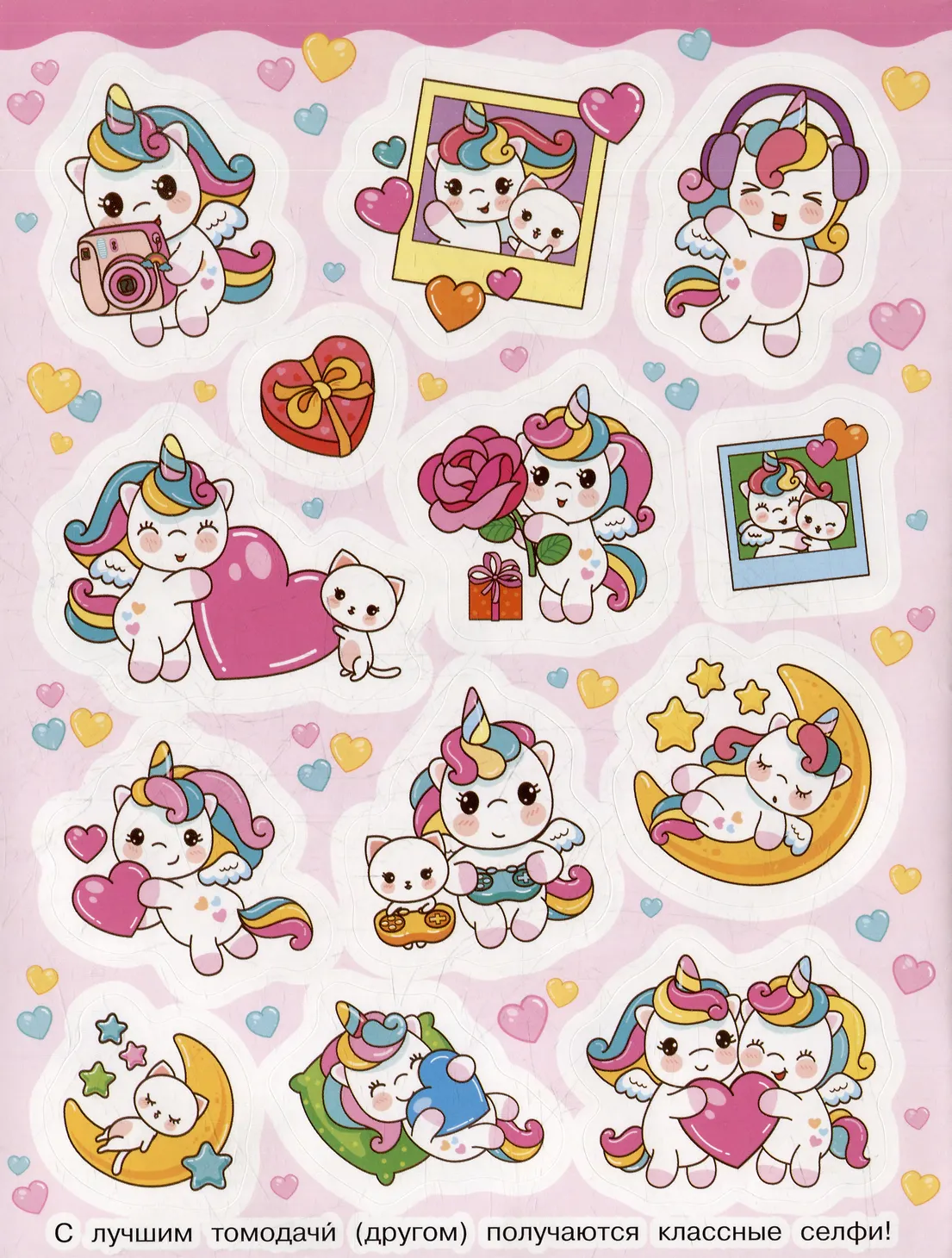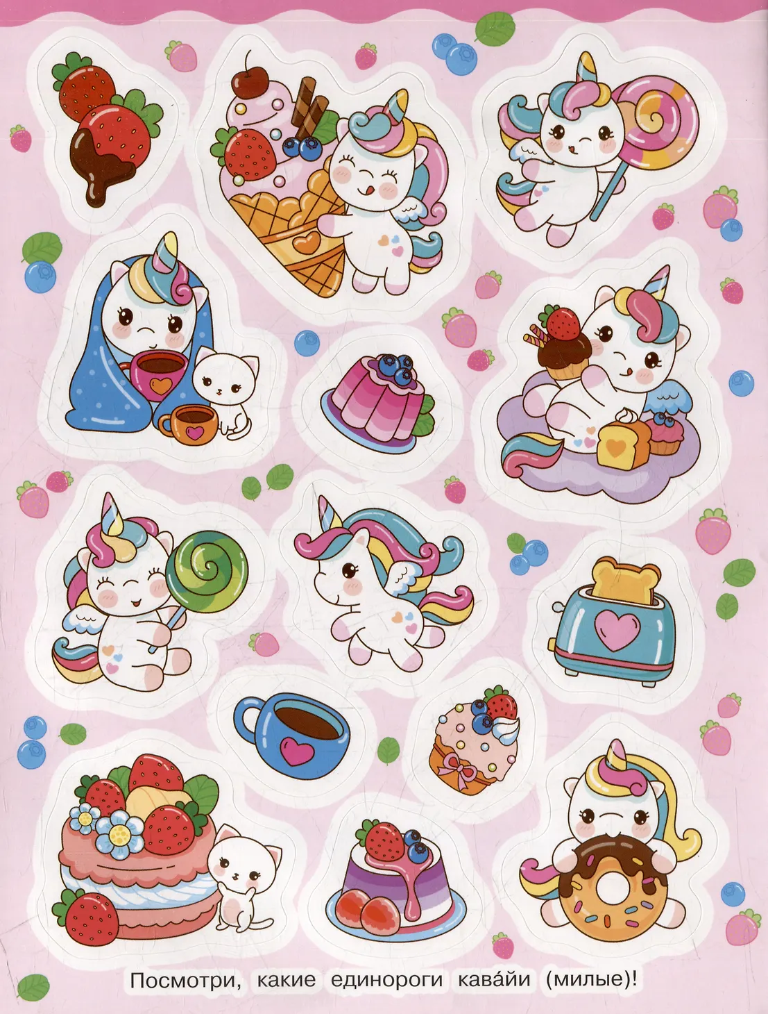 Коничива! (Добрый день!) Кавайные единорожки не дадут вам скучать! Играть, танцевать, путешествовать – каждый день можно делать что-то интересное. Уникальные яркие иллюстрации поднимут настроение даже в самый хмурый день. Наклейками можно украсить ежедневник, тетради, скетчбук, телефон и многое другое!