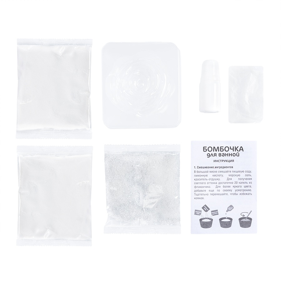 морская соль, сода пищевая, лимонная кислота, краситель пищевой с отдушкой, перчатки, пластиковая форма, инструкция