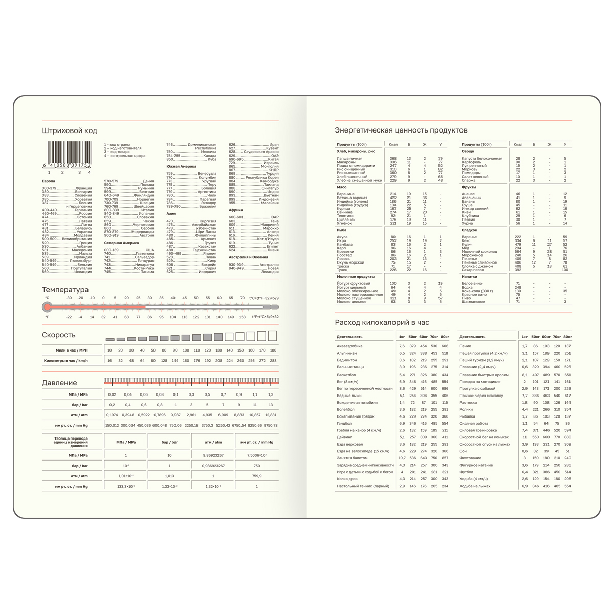 - Удобство планирования: недатированные листы с полем для даты позволяют начать ведение записей в любой день. Внутренний блок также включает справочную информацию, годовой планер и календарь.