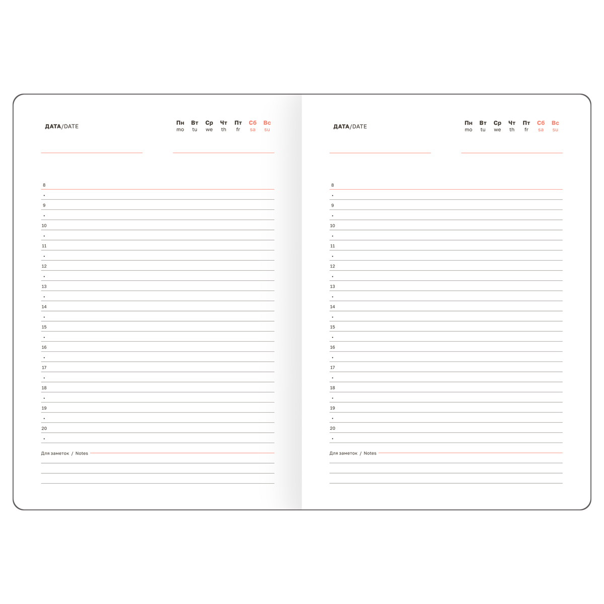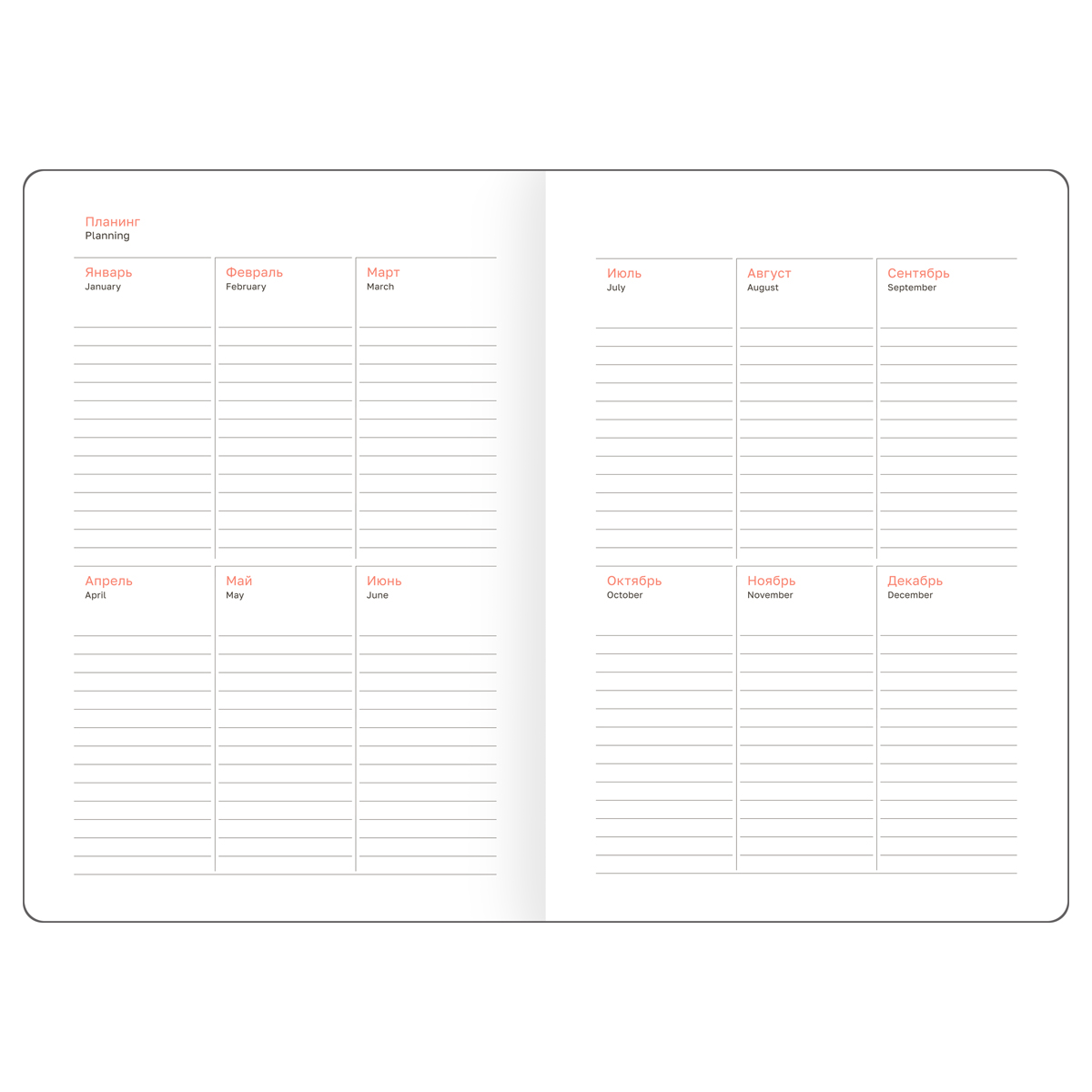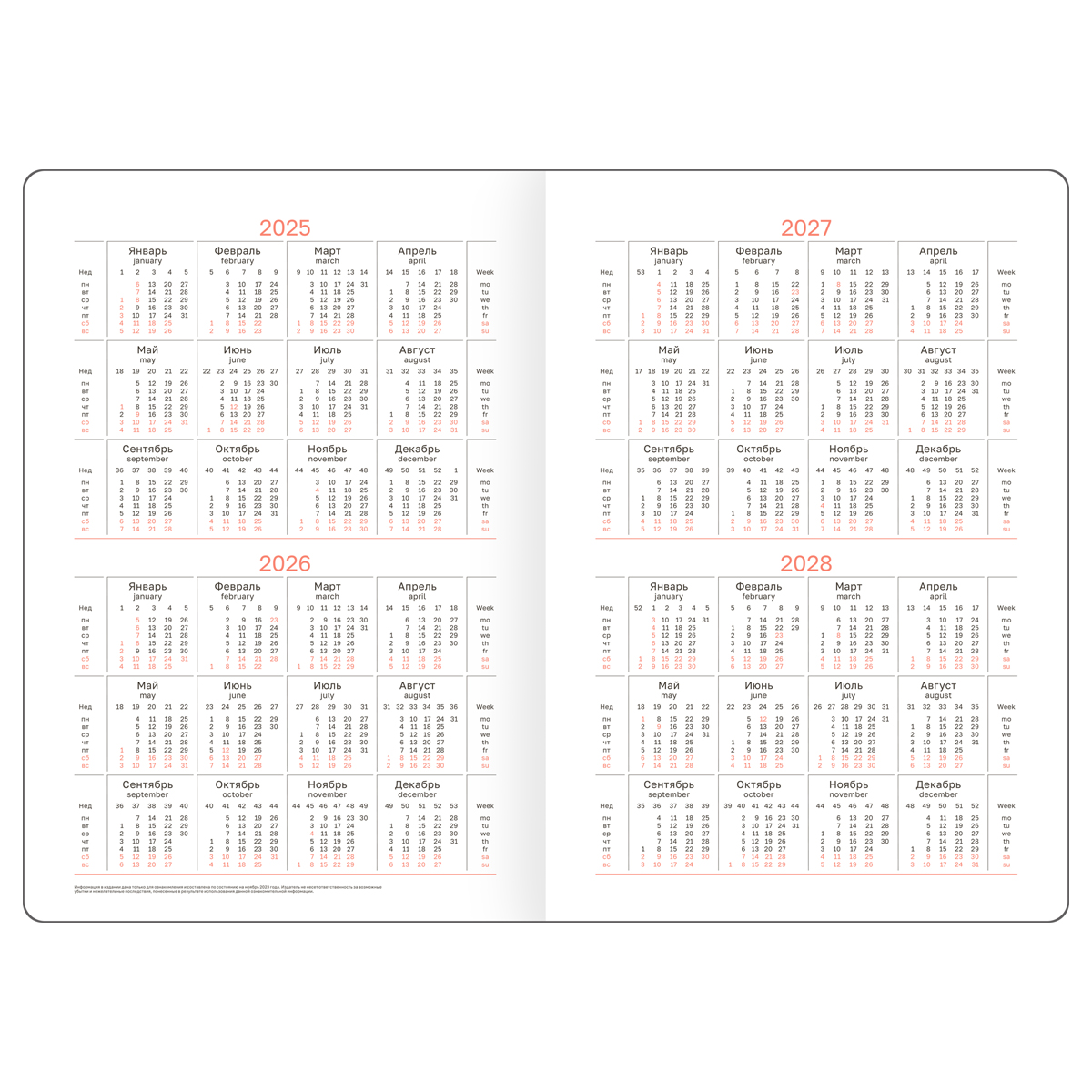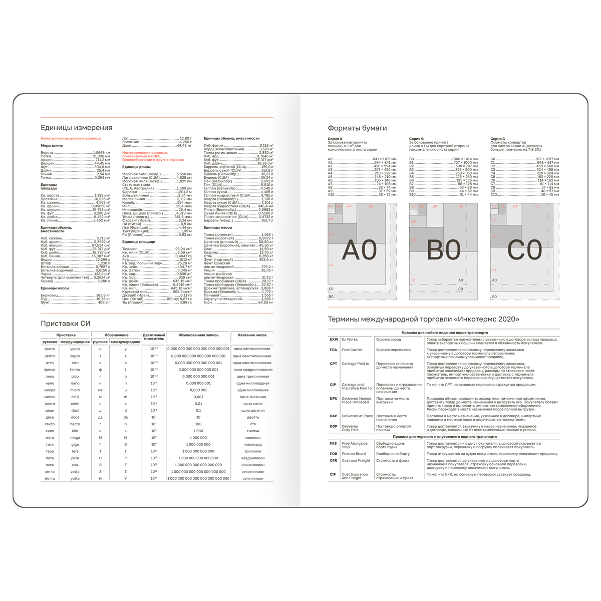 Внутренний блок состоит из 160 листов премиальной бумаги плотностью 70 г/м2 с печатью в две краски. Для максимального удобства планирования предусмотрены перфорированные уголки, закладка-ляссе, справочная информация и годовой планер. Поверхность обложки идеально подходит под персонализацию (тиснение), позволяя сделать ежедневник частью корпоративного стиля.