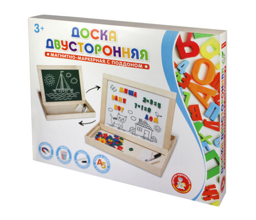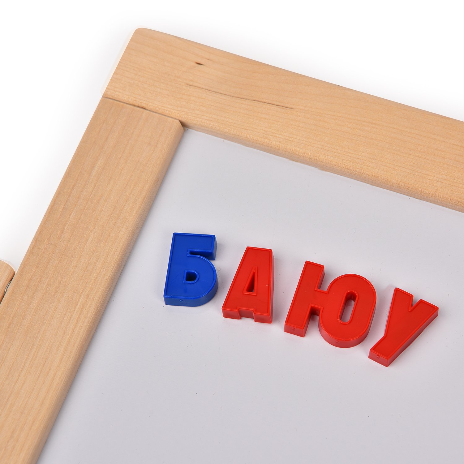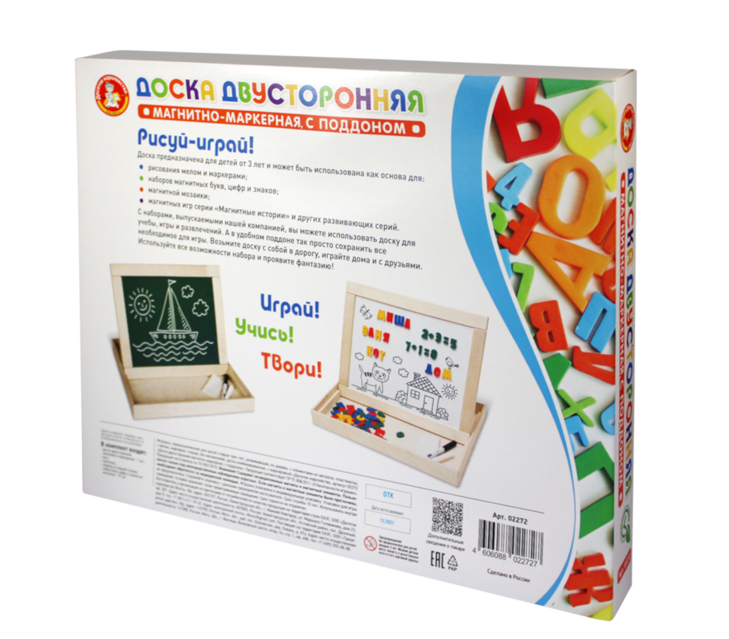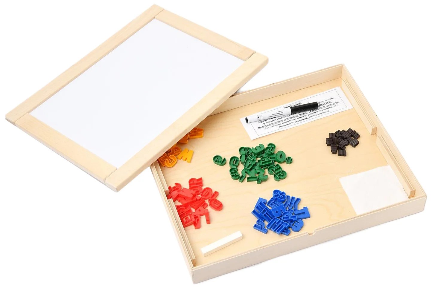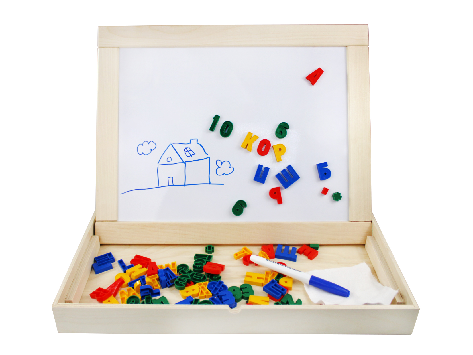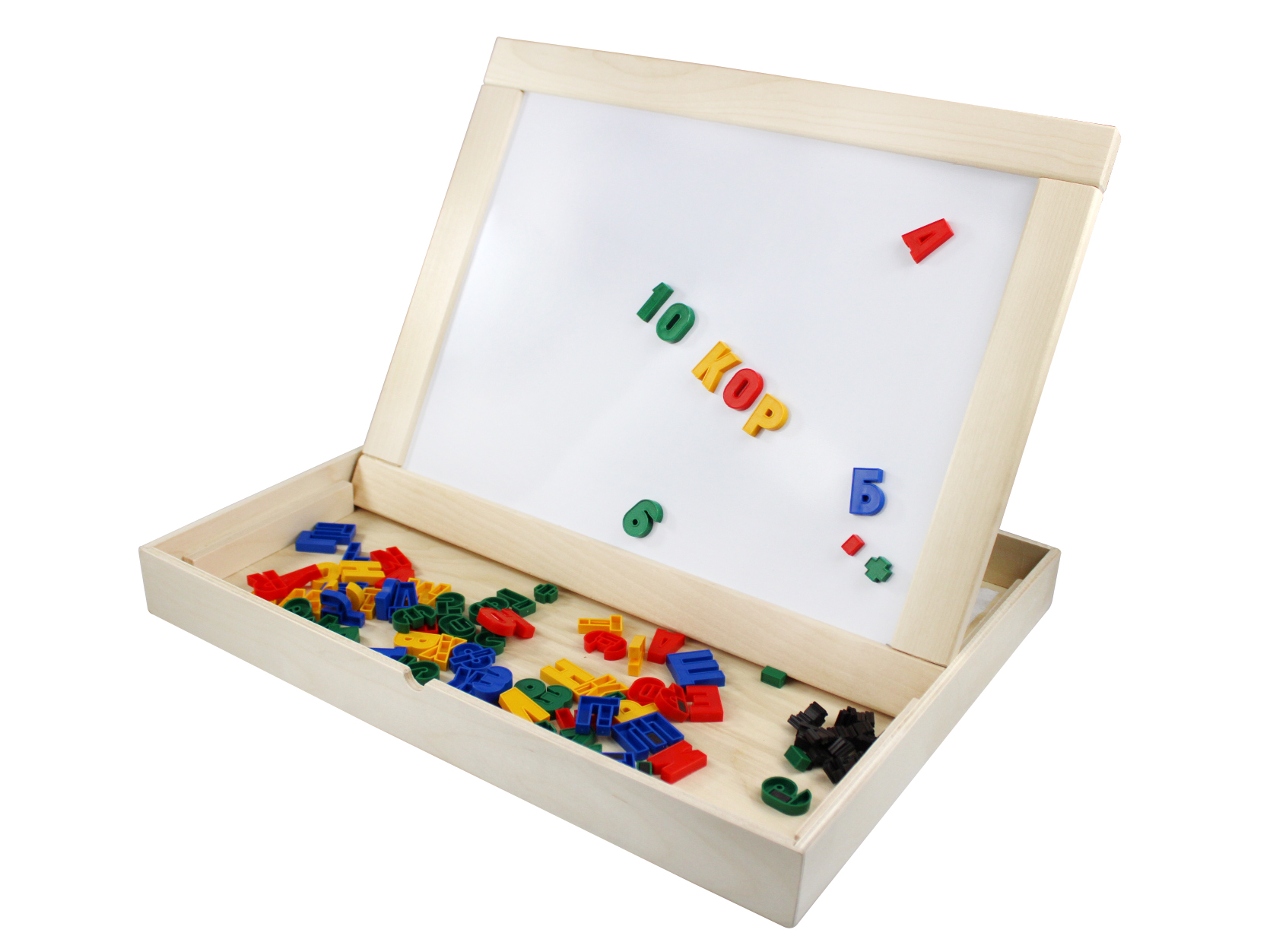 - В наборе: Доска, поддон, 2 мелка, тряпочка, маркер на водной основе, набор магнитных букв и цифр (высота элементов 2.5 см).