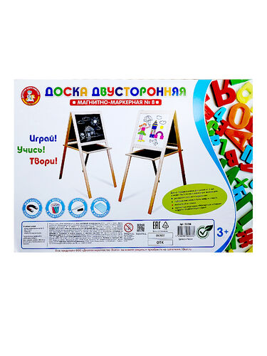 - Комплектация: Мольберт, 3 маркера на водной основе, 3 цветных мелка.