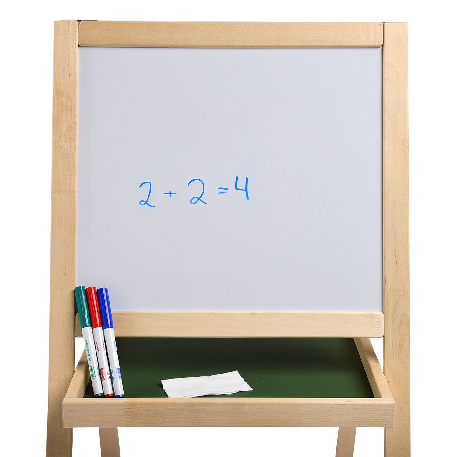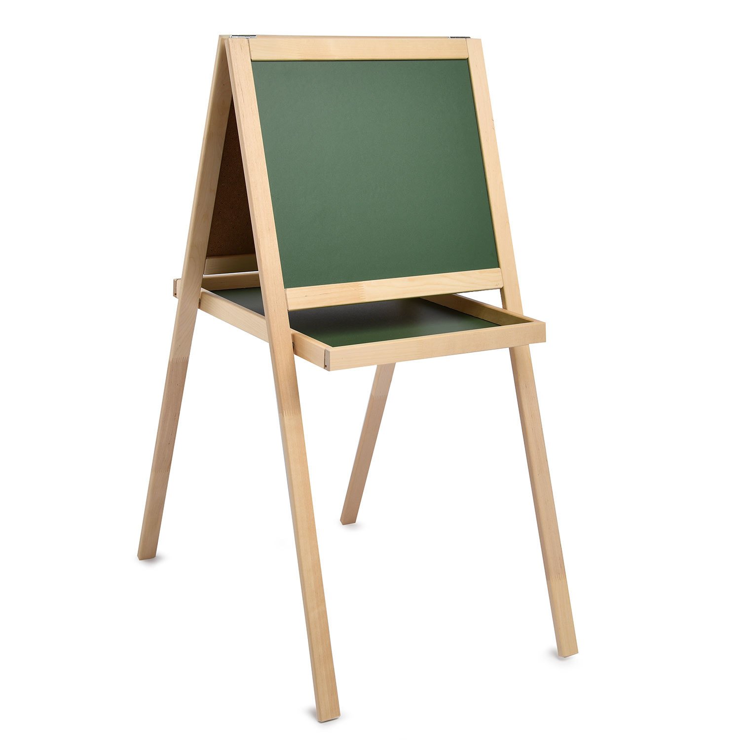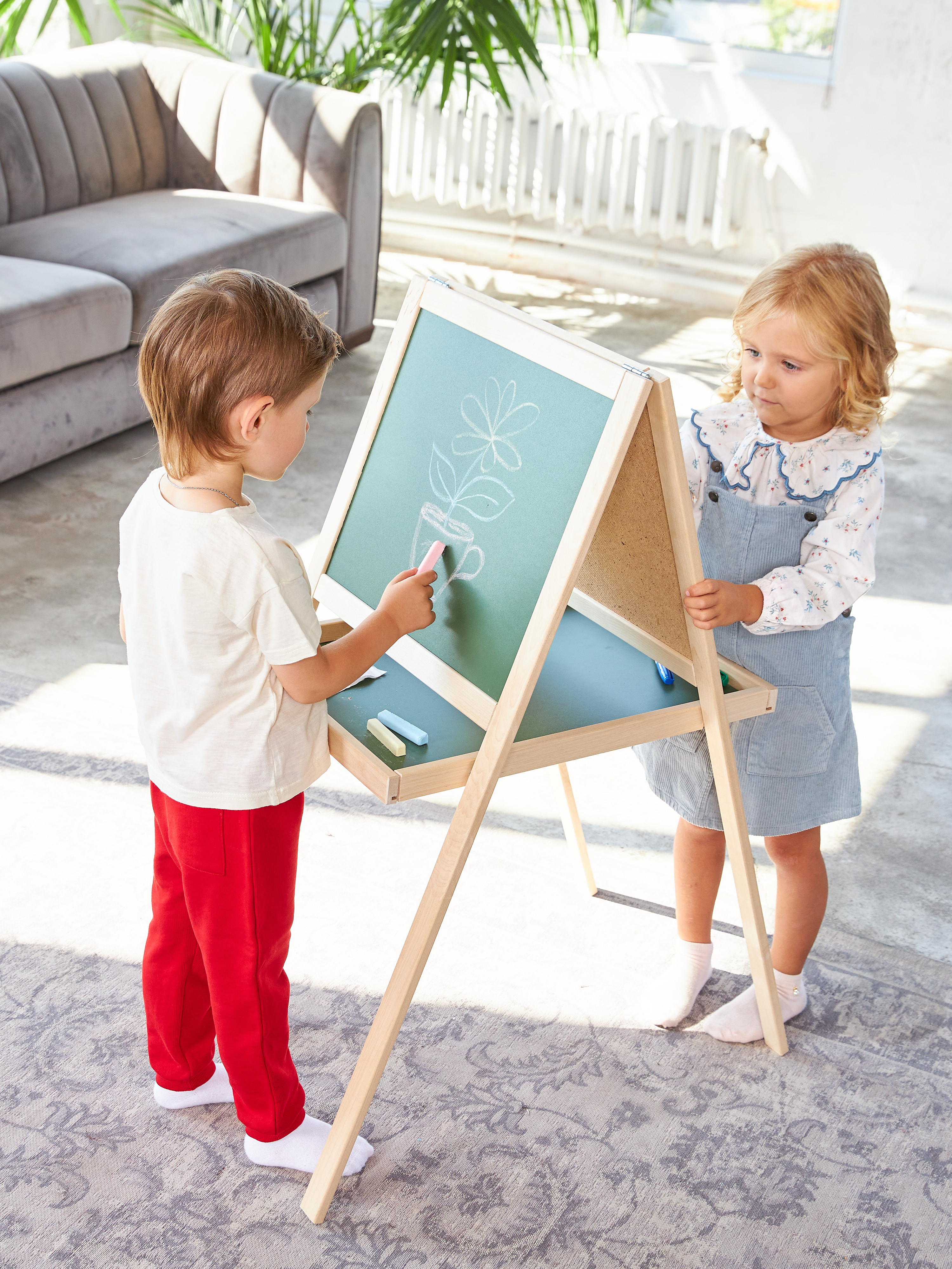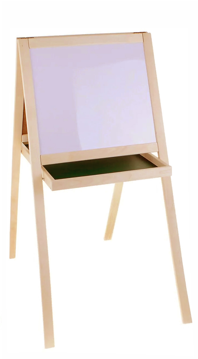 Универсальный двусторонний мольберт для творчества и подготовки к школе. Конструкция сочетает в себе две игровые зоны, позволяя ребенку чередовать разные техники рисования и обучения в рамках одного рабочего пространства.