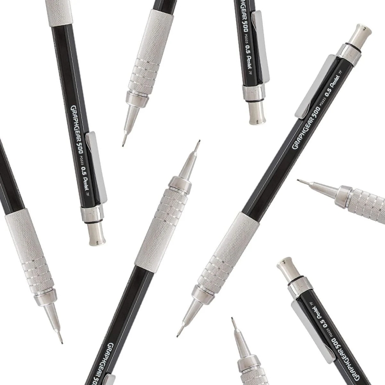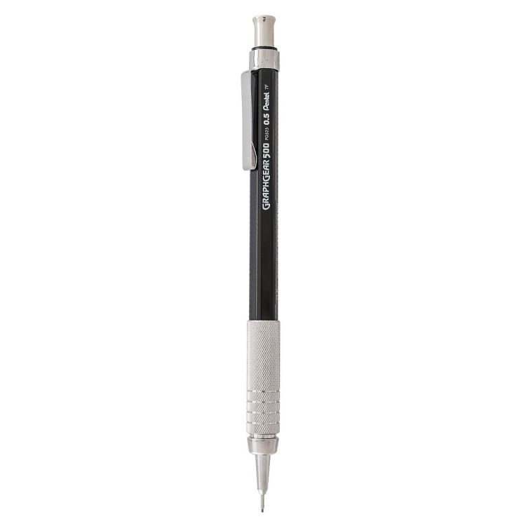 Pentel GraphGear 500 в стильном черном корпусе — это профессиональный механический карандаш, разработанный специально для художников, инженеров, архитекторов и студентов. В отличие от модели в серебристом корпусе, этот карандаш не имеет поворотного индикатора твердости. Тем не менее, он оснащен эргономичной зоной захвата из никелированной латуни, которая обеспечивает максимальный комфорт при длительной работе.