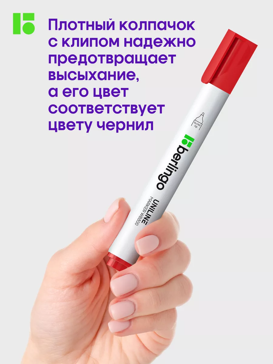 Маркер Berlingo Uniline WB300 — профессиональный инструмент, специально разработанный для письма на магнитно-маркерных поверхностях. Модель отличается высоким ресурсом: длина непрерывной линии письма достигает 500 метров, что делает её отличным выбором как для офиса, так и для учебных аудиторий. Чернила на спиртовой основе обеспечивают насыщенный цвет и легко удаляются с доски сухой губкой, не оставляя следов.