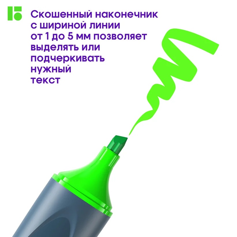 Благодаря скошенному наконечнику с шириной линии от 1 до 5 мм, маркер позволяет как тонко подчеркивать отдельные слова, так и выделять широкие фрагменты текста. Высокий ресурс письма в 300 метров гарантирует долговечность использования, а цветовые акценты на колпачке и деталях корпуса позволяют легко идентифицировать оттенок чернил.