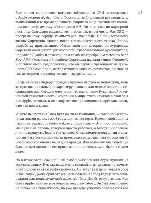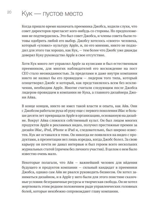 Пользуясь доступом к нескольким инсайдерам Apple, Кани рассказывает вдохновляющую историю человека, который рискнул заменить незаменимого. Благодаря уверенному и чуткому руководству, созданию инновационной системы производства и сбыта, а также преданности собственным ценностям он достиг больше, чем кто-либо мог вообразить.