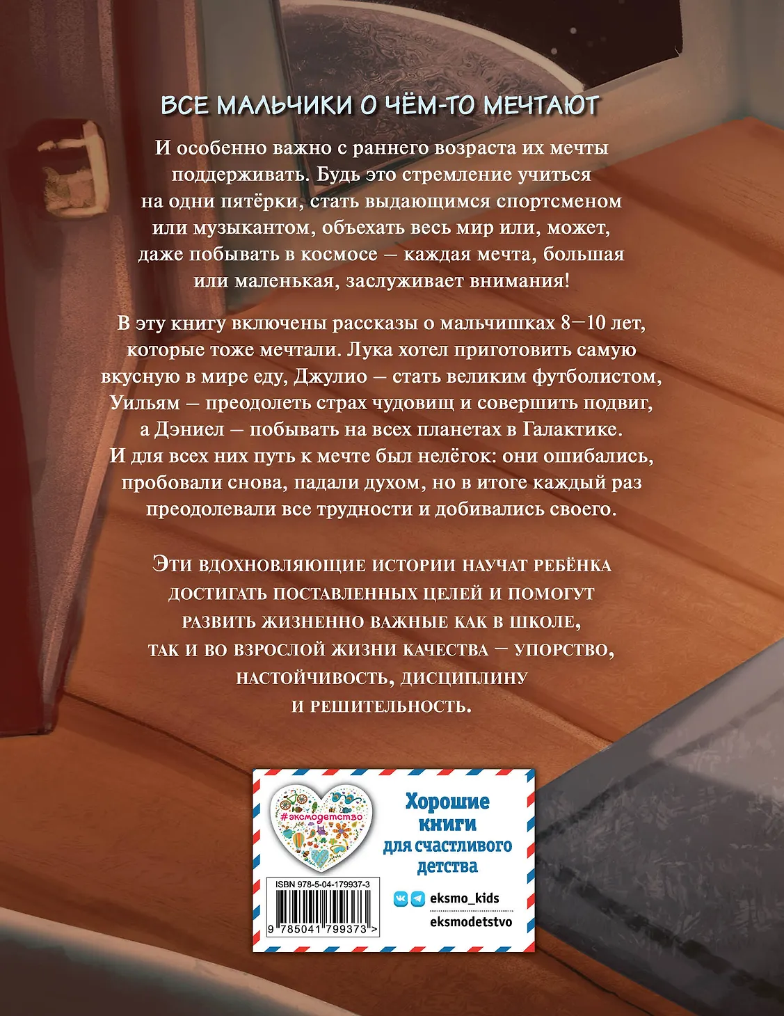Но взрослому человеку порой сложно подобрать ключ к детскому мышлению. И тогда на помощь придёт эта книга! В неё включены рассказы о мальчишках 8—10 лет, которые тоже мечтали. Лука хотел приготовить самую вкусную в мире еду, Джулио — стать великим футболистом, Уильям — преодолеть страх чудовищ и совершить подвиг, а Дэниел — побывать на всех планетах в галактике. И для всех них путь к мечте был нелёгок: они ошибались, пробовали снова, падали духом, но в итоге каждый раз преодолевали все трудности и добивались своего.