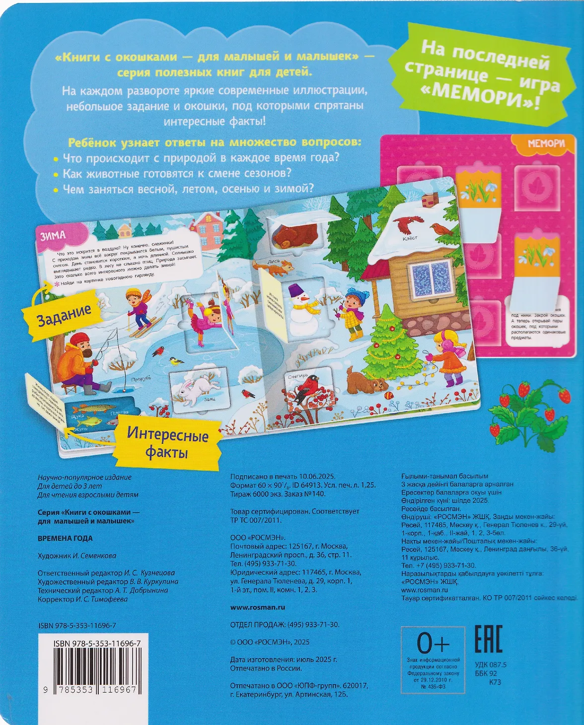 «Книги с окошками для малышей и малышек» - серия полезных книг для детей. На каждом развороте яркие современные иллюстрации, небольшое задание и окошки, под которыми спрятаны интересные факты! Ребёнок познакомится со сменой времен года и узнает ответы на множество вопросов: как вода зимой превращается в лед? Почему сажать деревья нужно весной? Что белки осенью прячут в дупло?