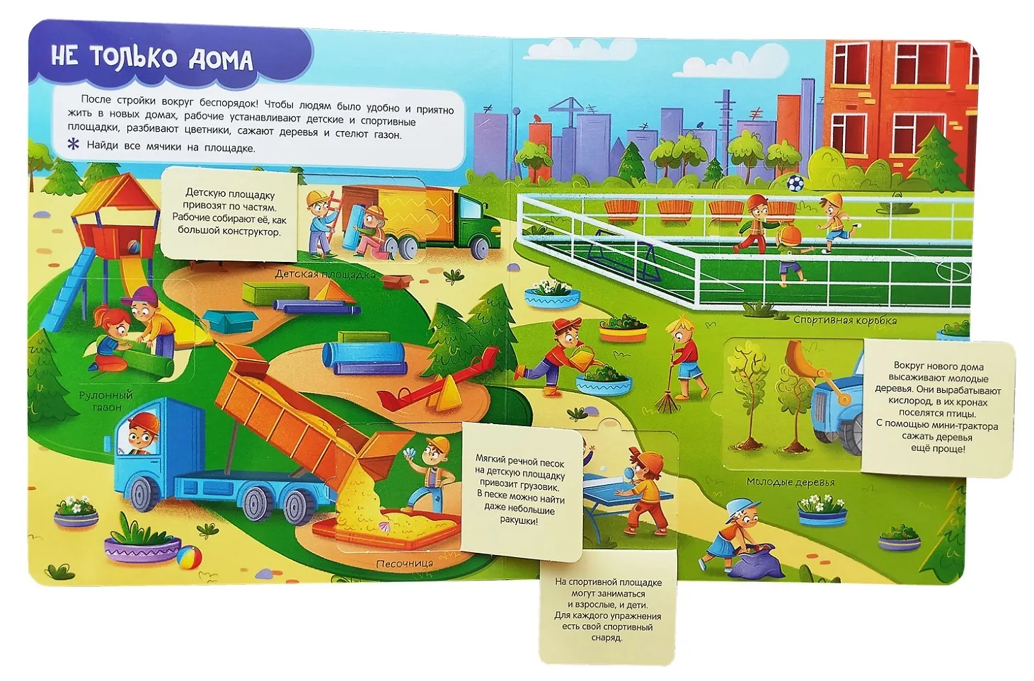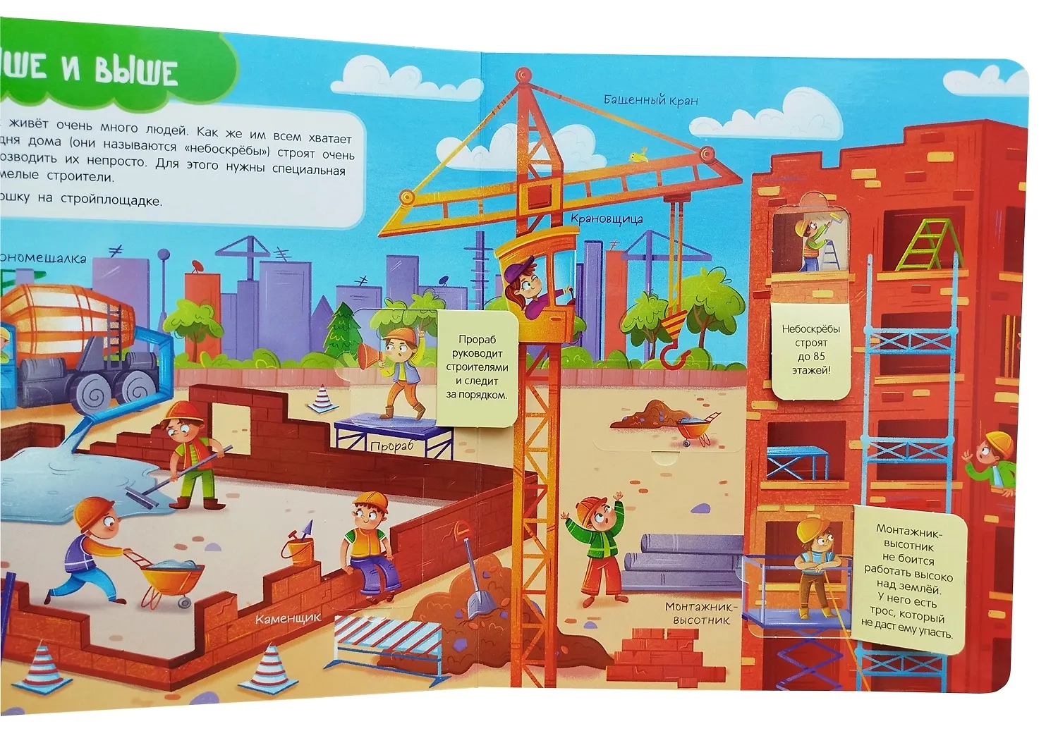 «Книги с окошками для малышей и малышек» серия полезных книг для детей. На каждом развороте яркие современные иллюстрации, и небольшое развивающее задание. Под множеством окошек-флепов скрываются яркие картинки и дополнительная информация. Дети узнают, как организована работа на стройке, встретятся с рабочими-строителями разных специальностей и познакомятся с умными машинами, строящими дома, дороги и мосты.