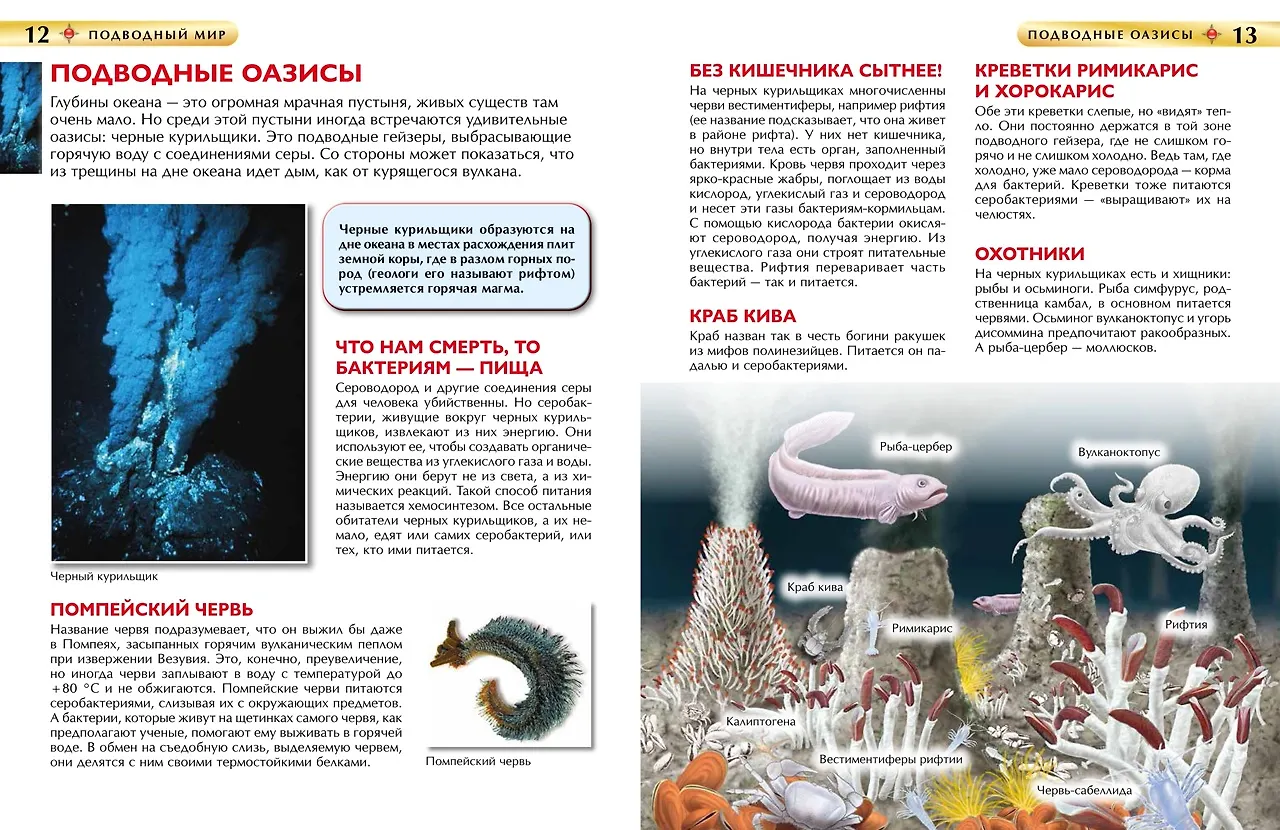 Книга предлагает отправиться в виртуальное путешествие по подводным «лесам», «пустыням» и «оазисам», чтобы познакомиться со множеством удивительных животных и растений. Когда вам еще удастся побывать на коралловых рифах, опуститься в подводную бездну, оказаться рядом с черными курильщиками?! Вы узнаете, видят ли слепые креветки, что на самом деле едят тюлени-крабоеды и осьминоги-вампиры, какие цветы растут в море, как светящиеся рыбы прячутся от врагов, и почему вода Байкала такая прозрачная, а также получите много других не менее любопытных сведений.