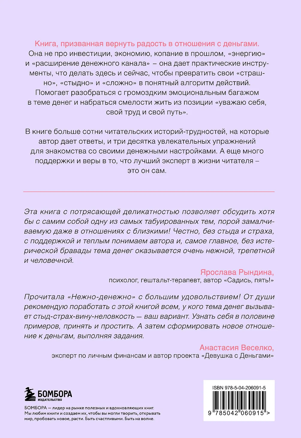 «Прочитала "Нежно-денежно" с большим удовольствием! От души рекомендую поработать с этой книгой всем, у кого тема денег вызывает стыд-страх-вину-неловкость-ваш вариант. Узнать себя в половине примеров, принять и простить. А затем сформировать новое отношение к деньгам, выполняя задания». — АНАСТАСИЯ ВЕСЕЛКО, эксперт по личным финансам и автор проекта «Девушка с Деньгами»
