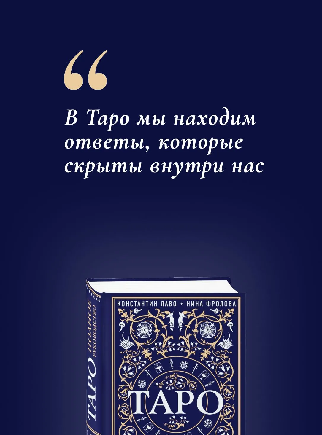В книге тарологов и преподавателей с многолетним опытом, членов Российского Таро-клуба Нины Фроловой и Константина Лаво есть всё, что нужно, чтобы освоить теорию и практику работы с картами Таро и искусство предсказания. Для того чтобы увидеть будущее, прояснить скрытые причины и следствия событий и тайные мотивы, больше не нужно владеть сверхъестественными способностями. Логика, точность и системный подход авторов помогут получить ответы на все интересующие вопросы.