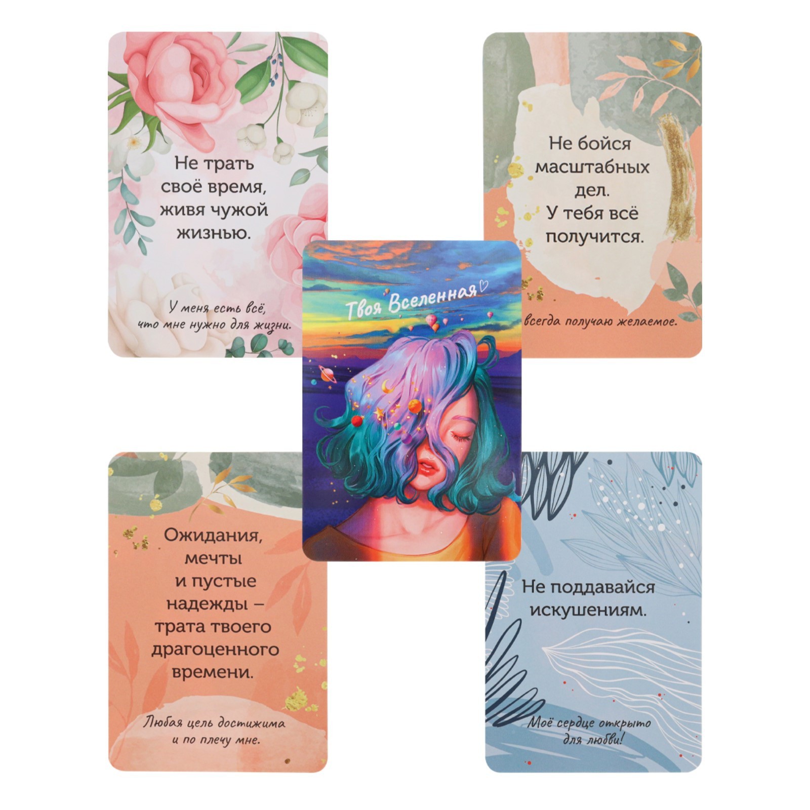 Метафорические ассоциативные карты МАК "Твоя Вселенная" Это колода из 67 вдохновляющих карточек с посланиями от Вселенной для процветания и уверенности в своих силах. Число 67 имеет тайный смысл — это знак ангелов-хранителей, которые всегда рядом. Они даруют силу и удачу, поддерживают в трудные минуты. По центру каждой карты написан ответ Вселенной на вопрос. Внизу карты располагаются аффирмации. Они помогут воплотить в реальность даже самые смелые желания и наполнят жизнь позитивной энергией.