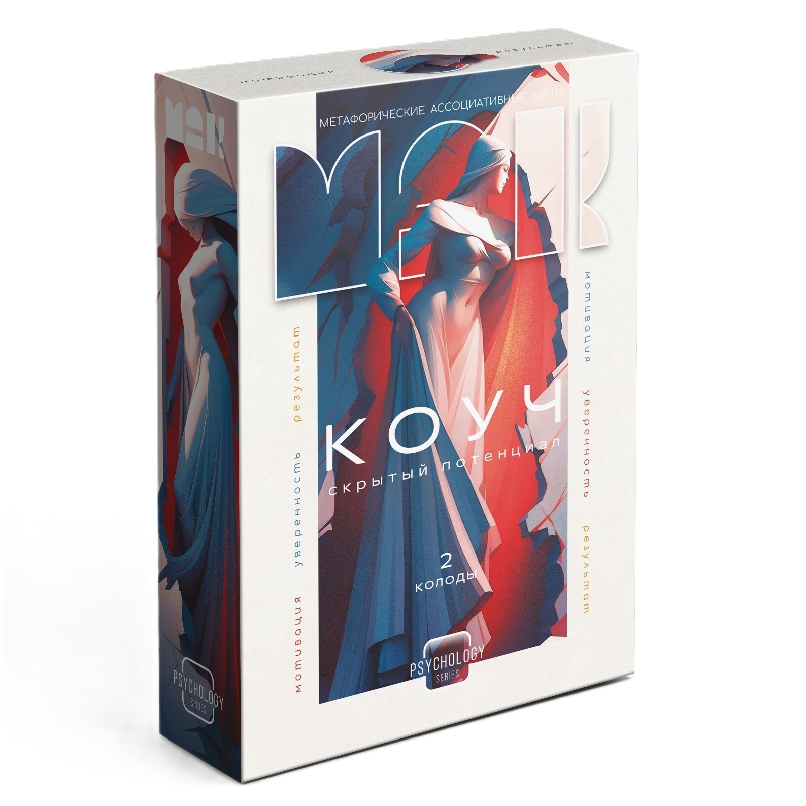 Набор коучинговых МАК включает в себя 2 колоды по 40 карт в каждой. Первая колода состоит из карт со словами, содержащих различные коучинговые модели. Вторая колода – это карты с изображениями, которые подробно раскрывают содержание используемых моделей.