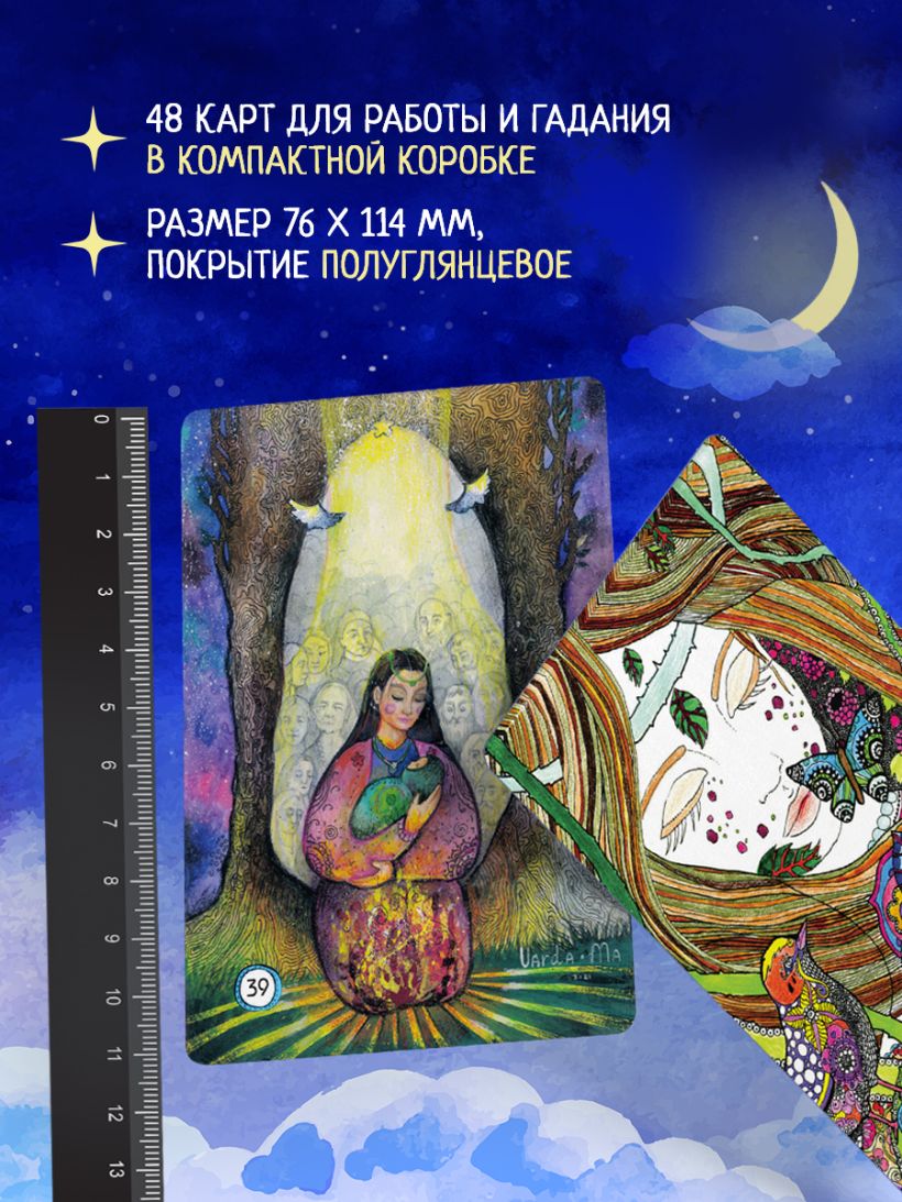 Все карты созданы с любовью к женской природе, к ее мудрым циклам, к позволению себе чувствовать, ощущать себя и мир и проявляться. В каждом образе есть ресурс и ответ на ваш вопрос — достаточно просто почувствовать и услышать свое, особенное послание Луны.