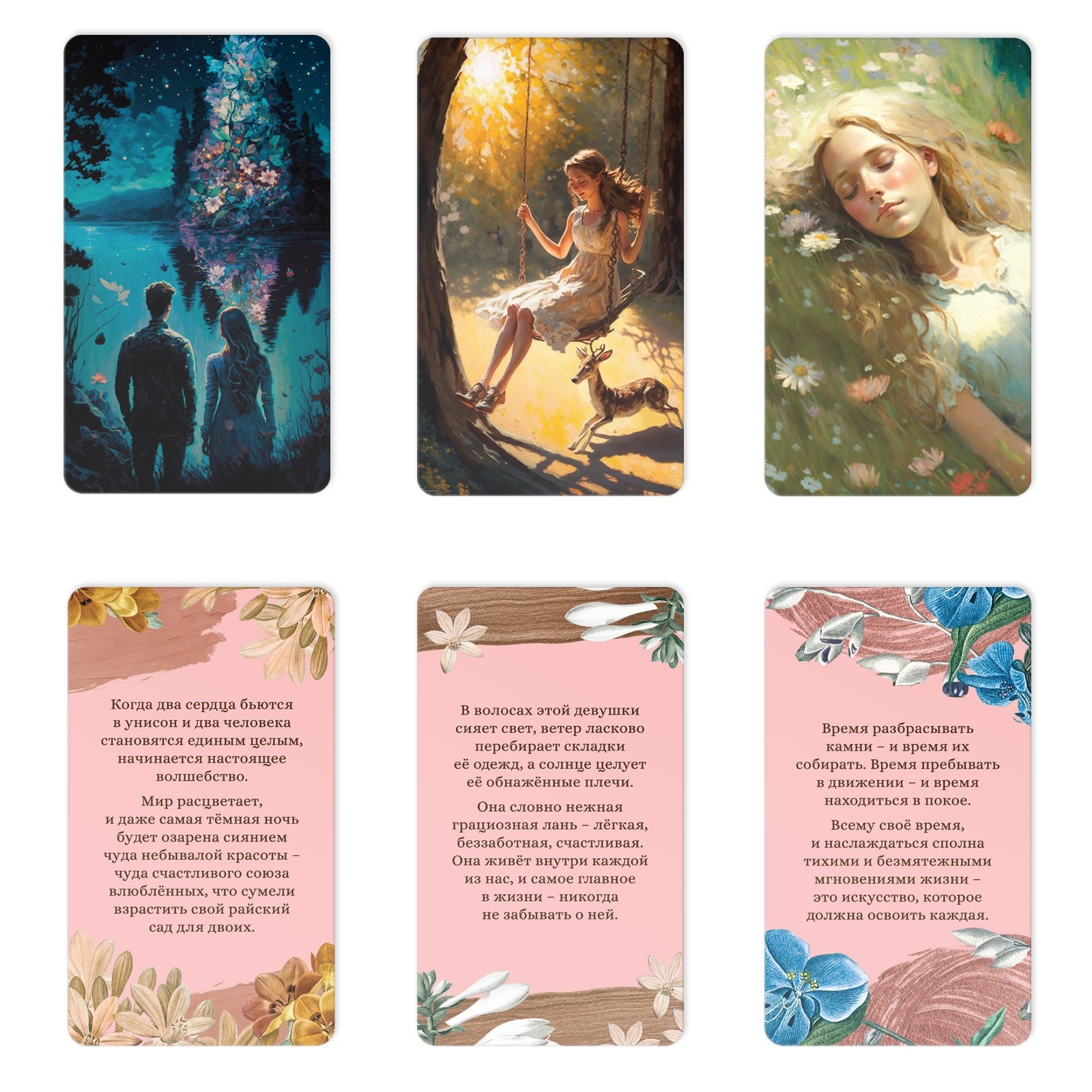 - Наполнение: Карты — это образы и персонажи, дополненные краткими метафорическими текстами.