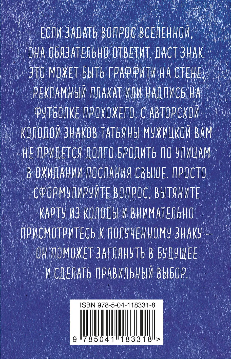 Если задать вопрос Вселенной, она обязательно ответит. Даст знак. Это может быть граффити на стене, рекламный плакат или надпись на футболке прохожего. С авторской колодой знаков Татьяны Мужицкой вам не придется долго бродить по улицам в ожидании послания свыше. Карты в этой колоде — не просто изображения, это история одного из нас, одного знака, одной рожденной мысли, одного принятия и многих реальных шагов, которые меняют нашу жизнь к лучшему. Татьяна собирала эти знаки по всей стране, чтобы сейчас вы смогли расслабиться и поговорить со Вселенной.