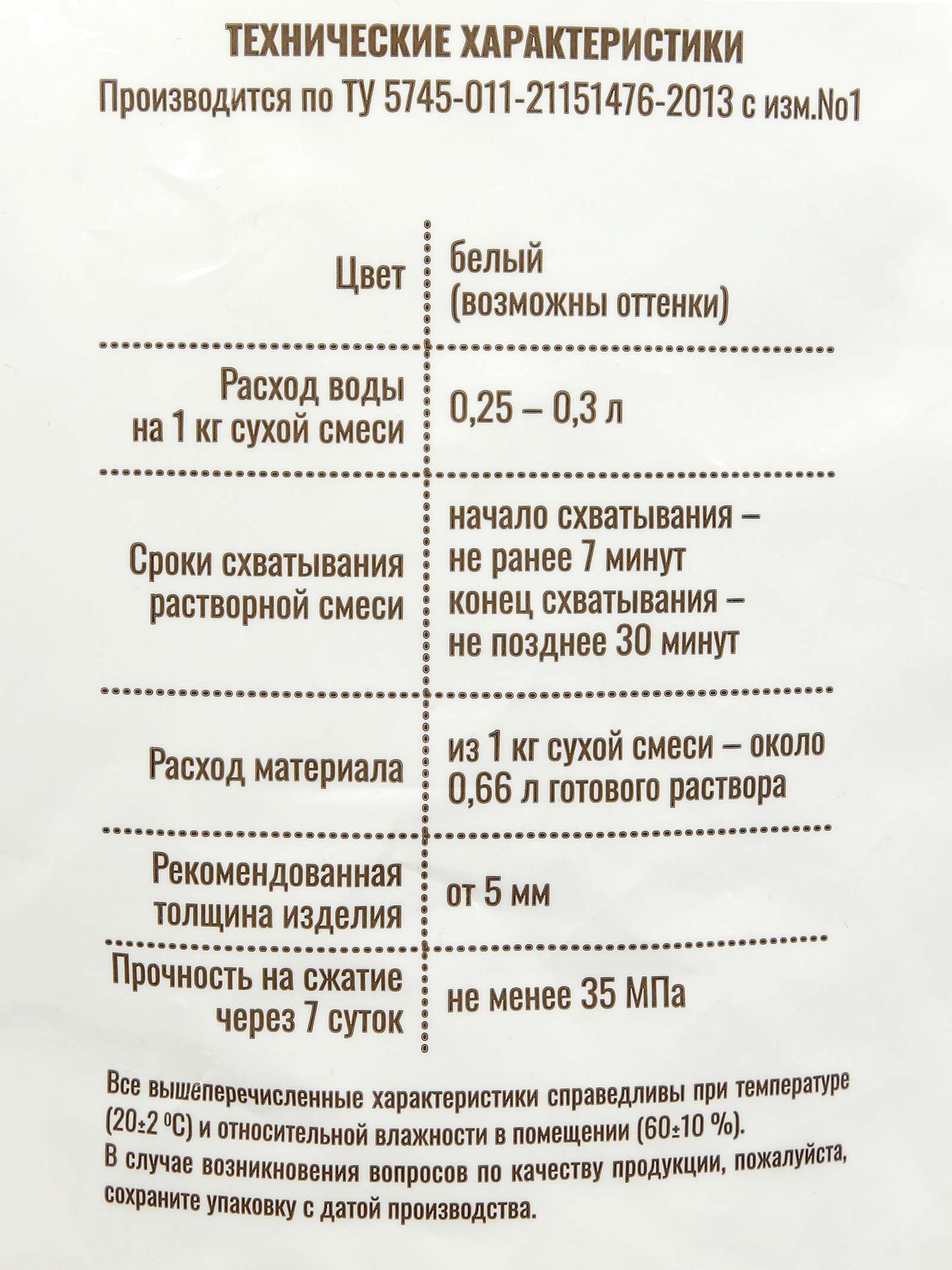 Состав: высокопрочный гипс, наполнители, цемент, модифицирующие добавки.