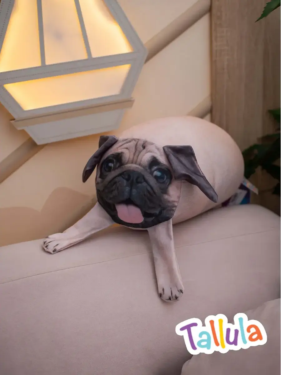 Новая мягкая игрушка от Tallula точно произведёт на вас впечатление! Необычный дизайн в совокупности с реалистичным принтом мопса сразу привлечёт к себе всё внимание.