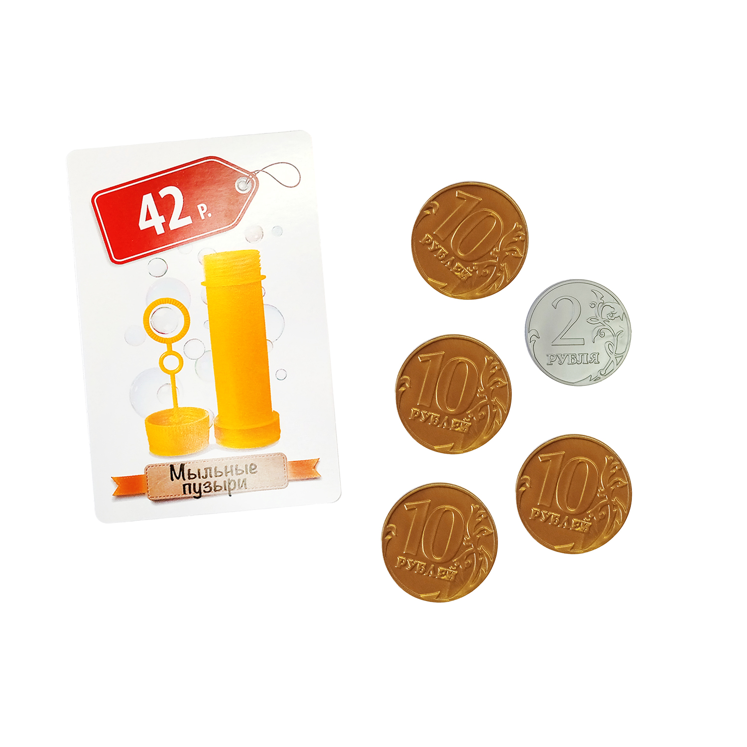 карточки товаров с ценниками – 14 шт, игральный кубик с изображёнными на гранях номиналами монет, монеты 1, 2, 5, 10 руб. – 52 шт, правила игры
