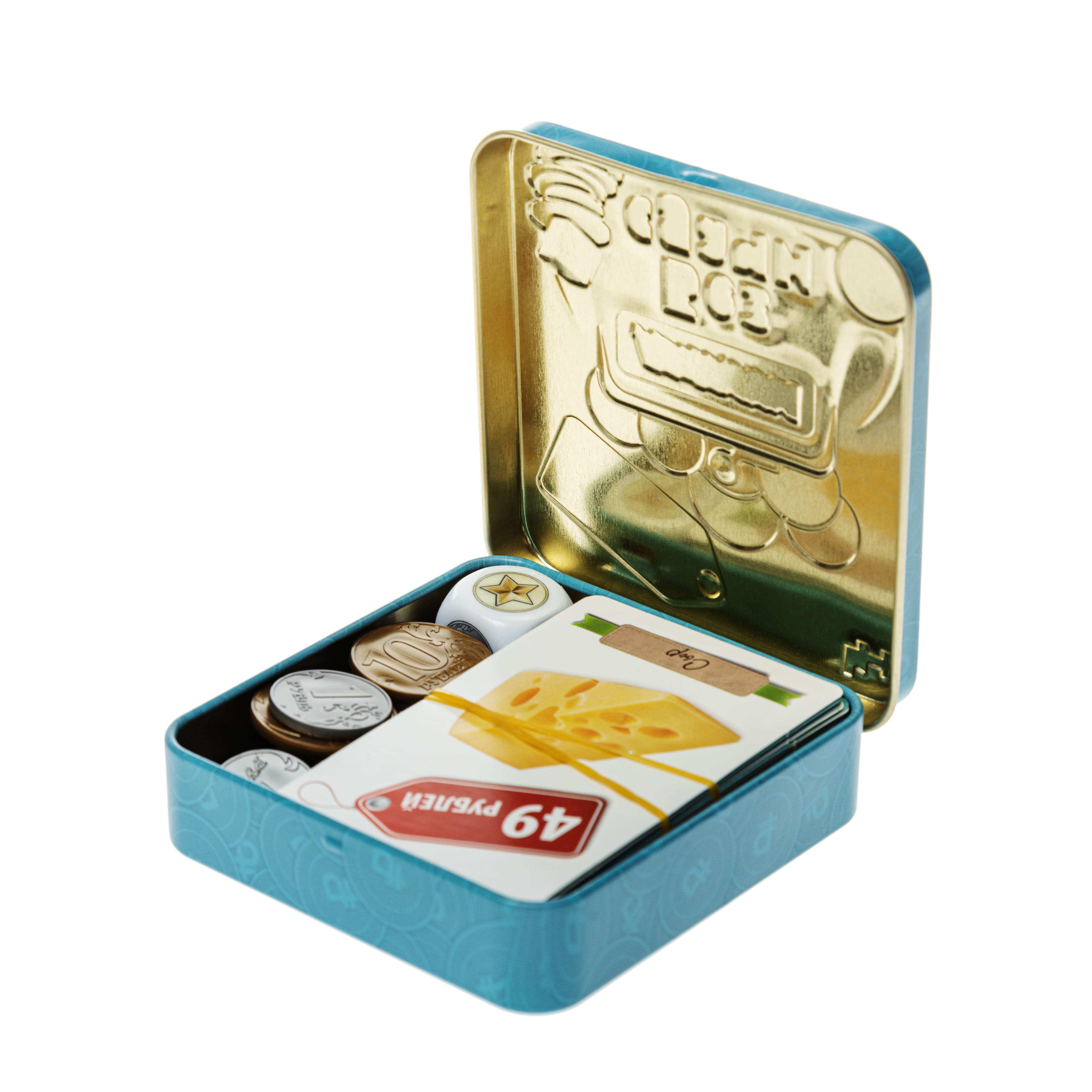 - Специальный игральный кубик с номиналами монет.