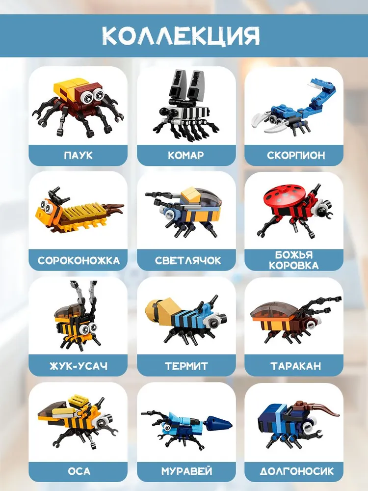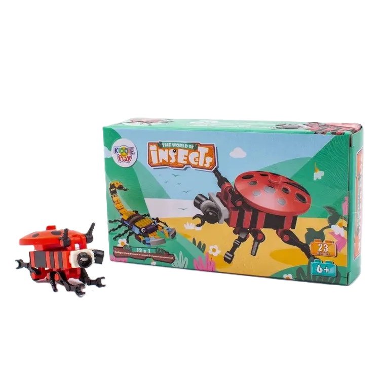 - Ребёнок может собрать множество насекомых: муравья, комара, скорпиона, сороконожку, светлячка, божью коровку, жука-усача, термита, таракана, осу, паука и долгоносика.