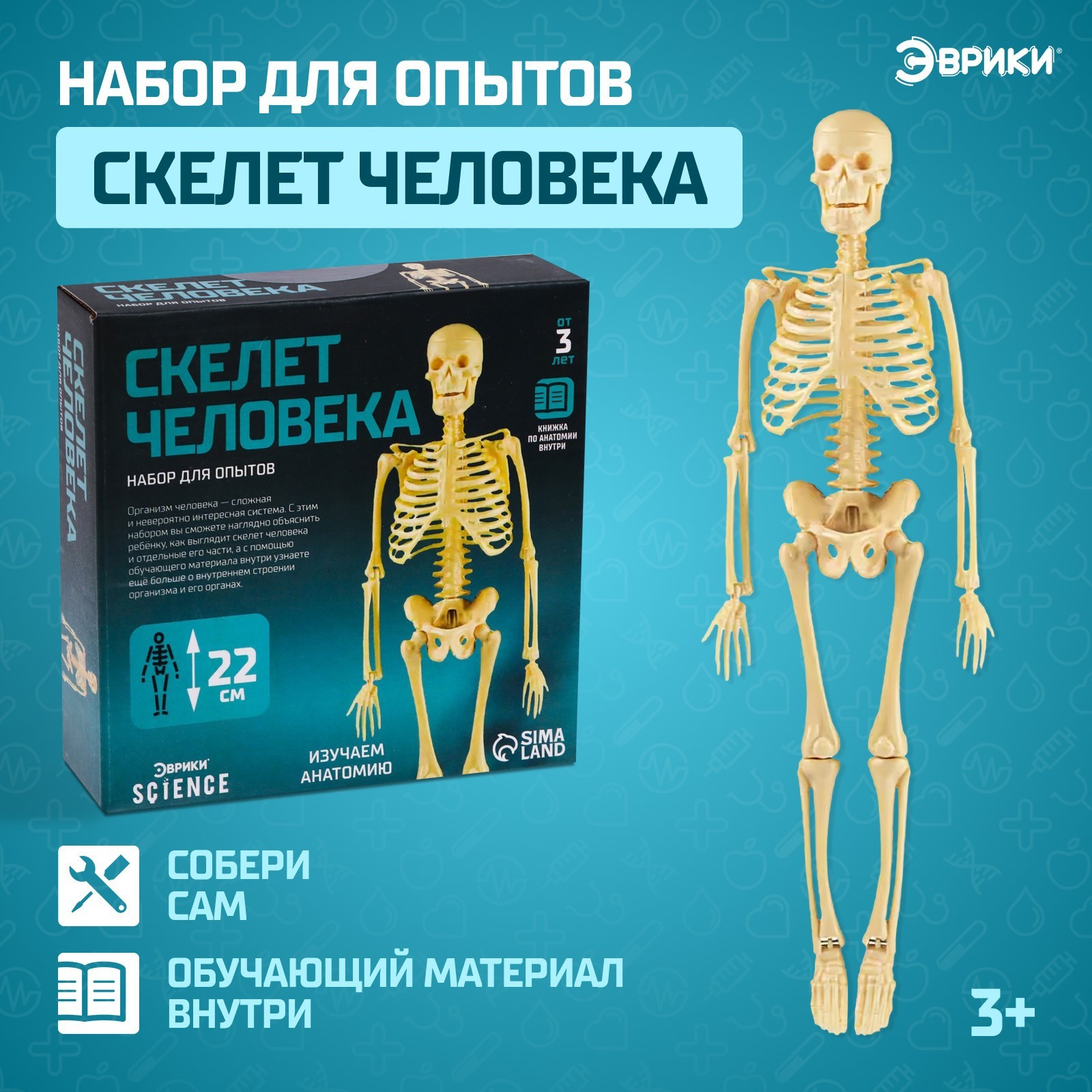 Набор для изучения анатомии человека поможет детям познакомиться с основами строения скелета. Этот увлекательный экспериментальный комплект включает все необходимые элементы для сборки точной модели костей человека.