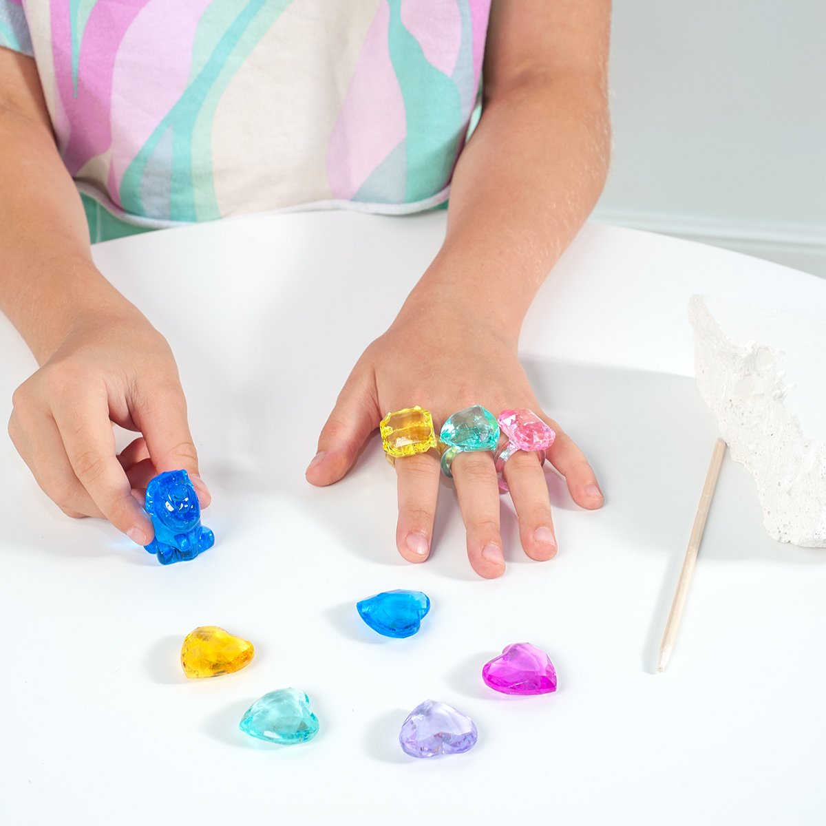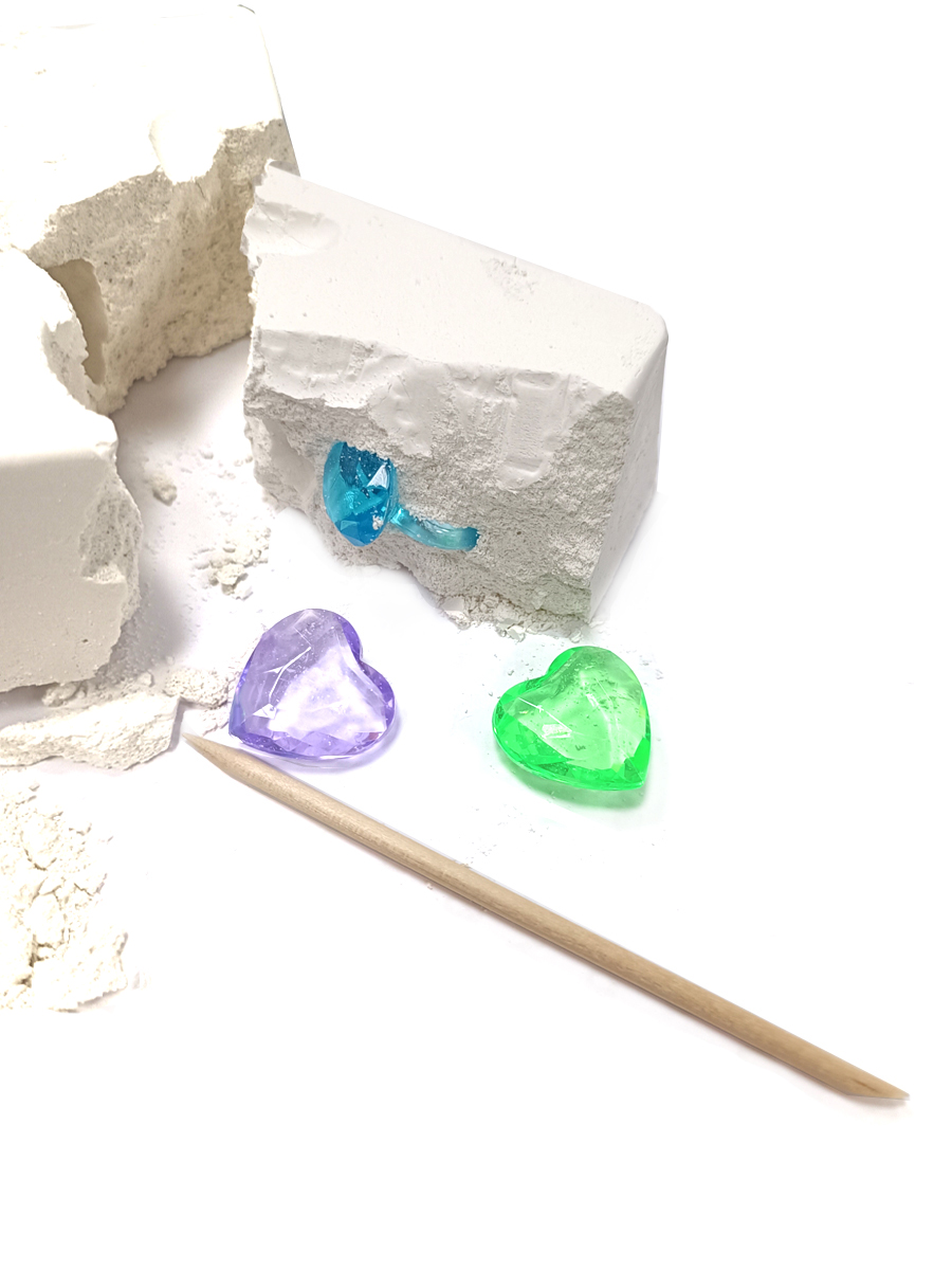 Начинаем раскопки! Какие сокровища спрятаны внутри? Откалывайте кусочки грунта с помощью специального стека, чтобы найти яркие, сверкающие фигурки и украшения.
