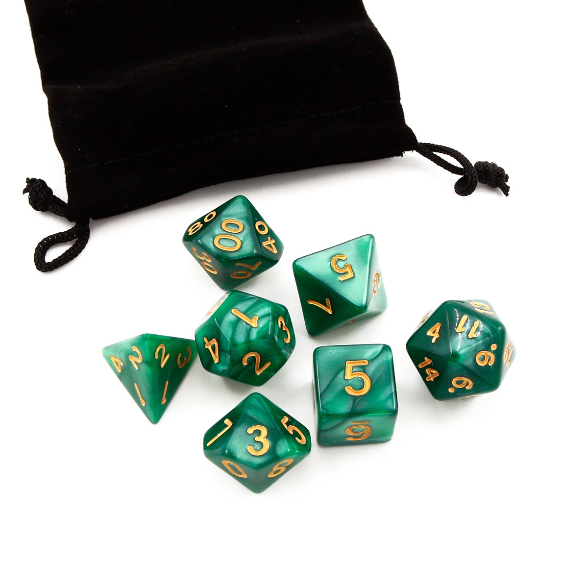 Наборы кубиков для ролевых игр решают проблему покупки необходимых дайсов. В наборе содержатся семь кубиков: D4, D6, D8, D10, D10%, D12 и D20. Поставляются кубики в комплекте с бархатным мешочком для хранения, который также удобно брать с собой на игру, ведь он легко помещается в карман.