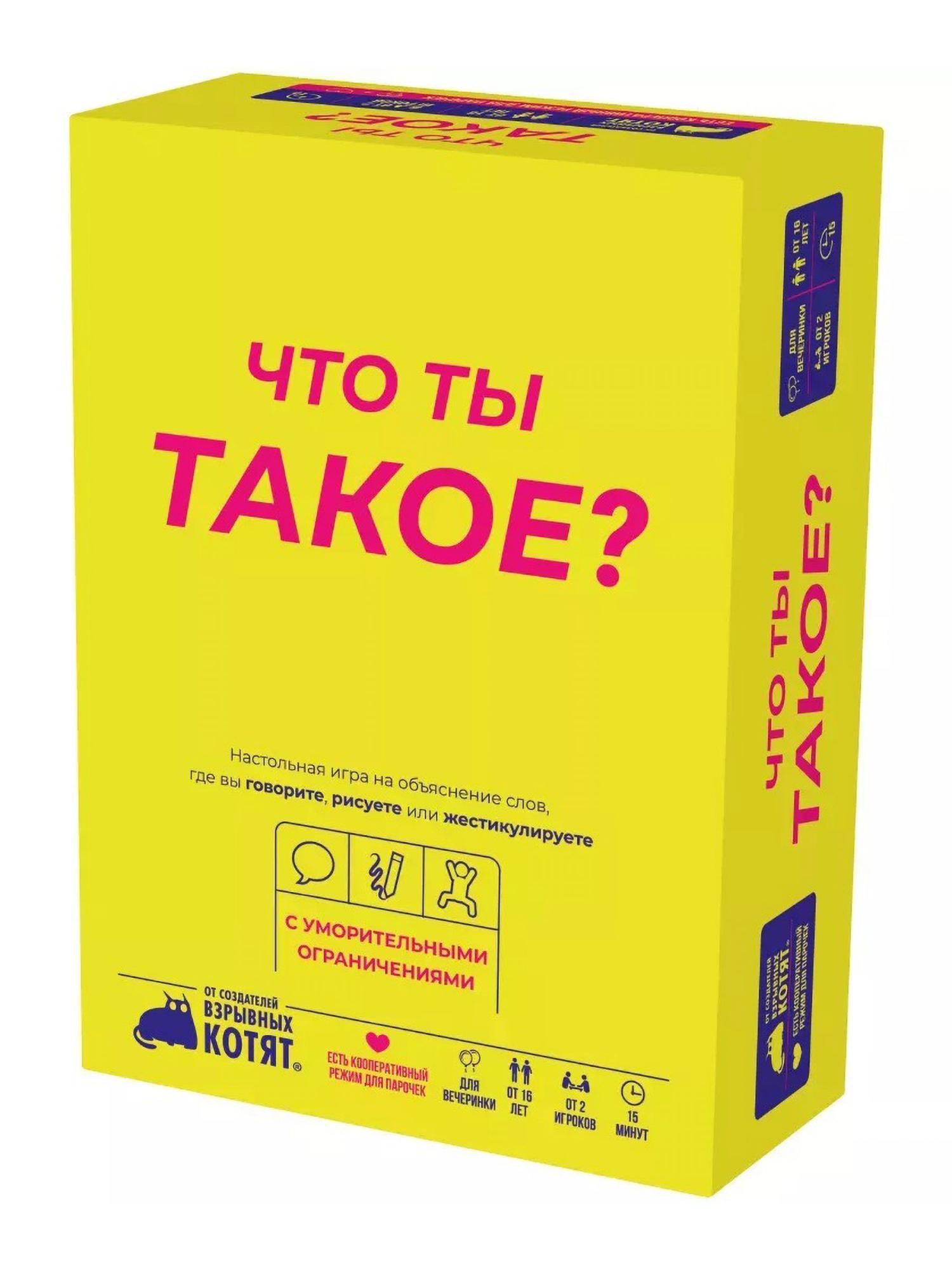 "Что ты такое?" могла стать очередной игрой на объяснение слов, но она не стала! А всё благодаря своей изюминке – забавным ограничениям, превращающим игровой процесс в театр абсурда и нескончаемой уморы. Вот представьте: вы вытянули карту задания, а она говорит вам объясняться рисунком, НО В ПРОЦЕССЕ ВАША ГОЛОВА ДОЛЖНА ЛЕЖАТЬ НА СТОЛЕ. Или вы должны объяснить слово жестами, НО В ЭТО ВРЕМЯ ВЫ ОБЯЗАНЫ КРУЖИТЬСЯ ВОКРУГ СЕБЯ ВСЁ ВРЕМЯ. Звучит безумно, не правда ли? А выглядит ещё безумнее и смешнее, отчего в голове и возникает тот самый вопрос: да что же ты такое?