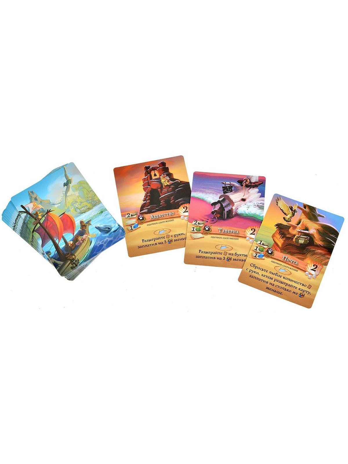 Если вы уже заняли всех своих работников делами, можете в свой ход разыгрывать карты, причём не только с руки, но и из бухты. Для этого вам нужно заплатить ресурсы, указанные слева от названия карты, и выложить её перед собой лицом вверх – поздравляю, вы только что расширили свой город! А если хотите разыграть карту персонажа, но вам не хватает ресурсов, прибегните к помощи якорей: потратив один такой жетон, разместите персонажа в свой город бесплатно! Но на всю игру у вас всего 3 якоря. А ещё, когда вы разыгрываете карту, которая соответствует одному из жетонов роз ветров, ваш корабль перемещается по морскому пути.
