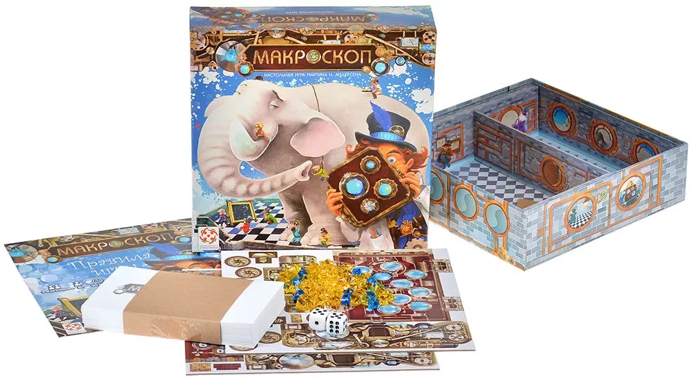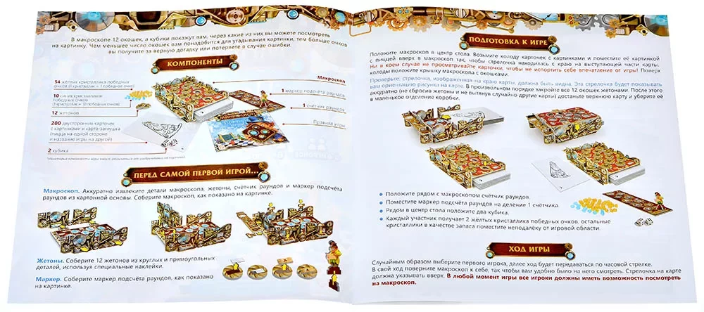 Центральным и неотъемлемым элементом веселья является макроскоп – прибор с 12 окошками. Каждый игрок получает кристаллики и готовится к разгадыванию изображений.