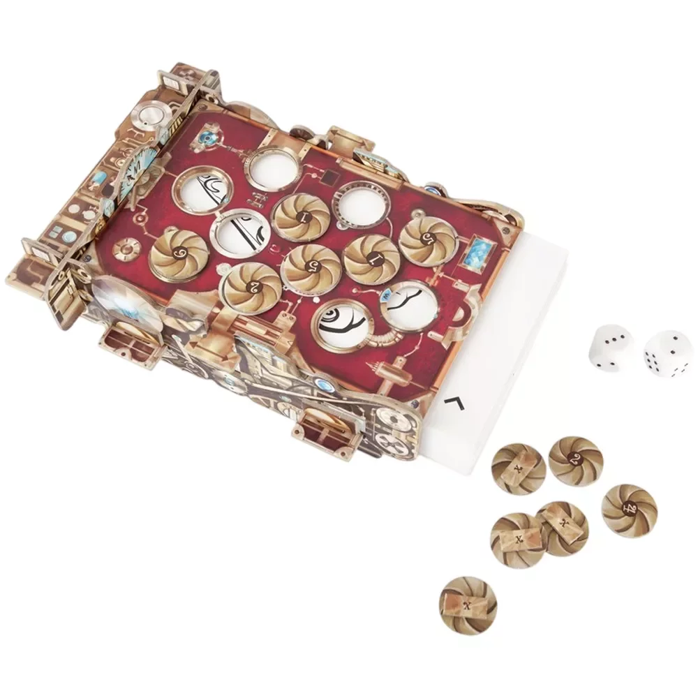 Каждый ход вам предстоит бросать два кубика: какие числа вам выпадут, под таким номером вы и сможете открыть окошко или два на крышке макроскопа, чтобы увидеть через них небольшие части картинки. Чем меньше окошек открыто, тем больше очков можно заработать, так что подходите к делу взвешенно и с умом.