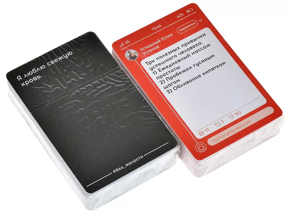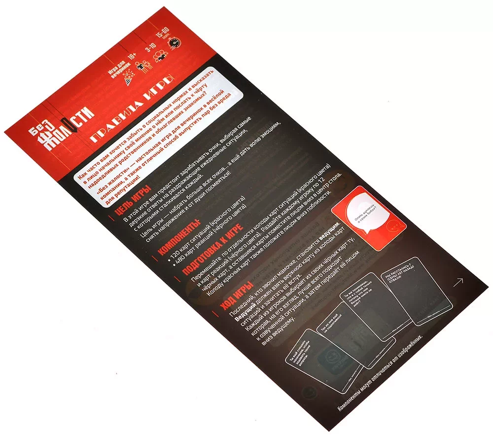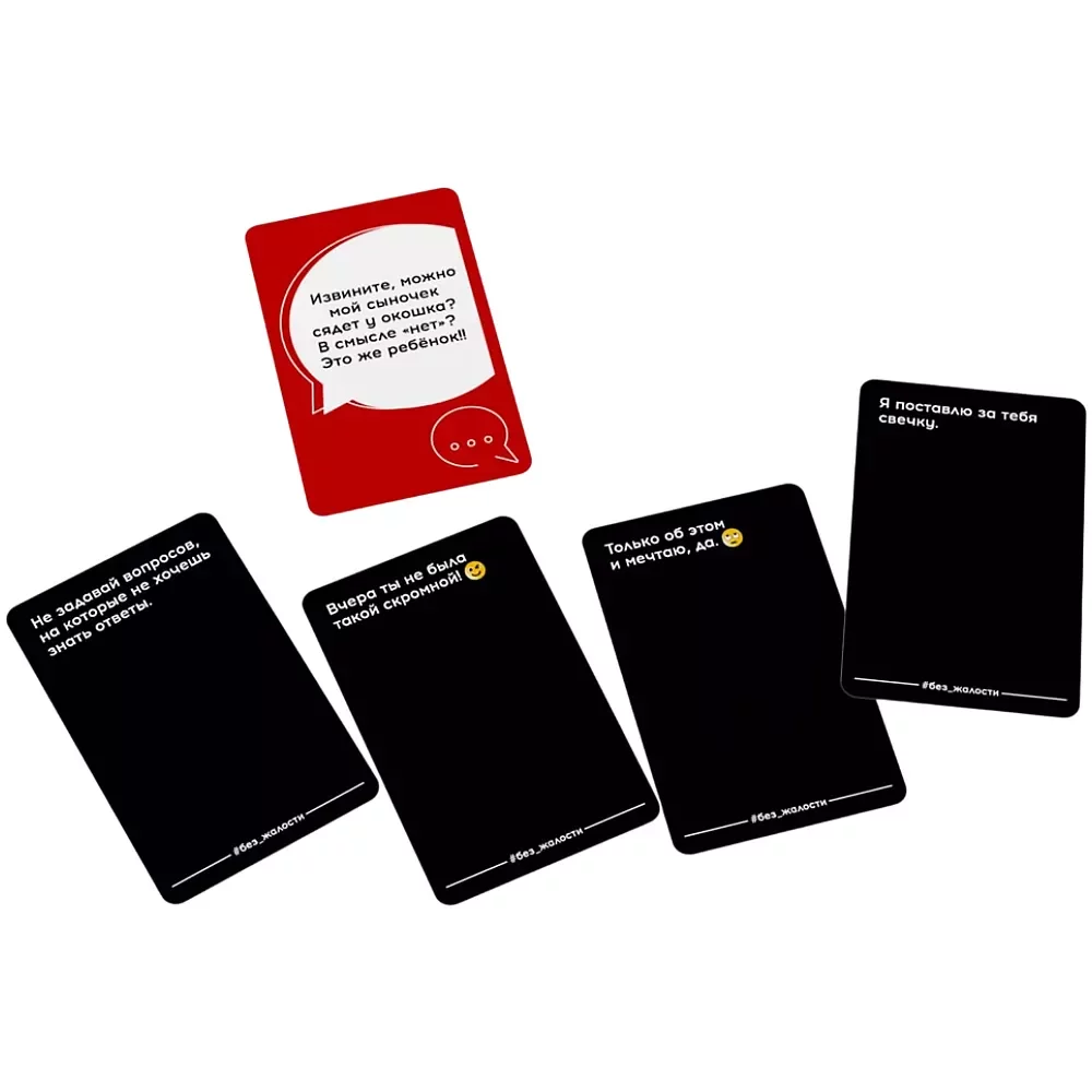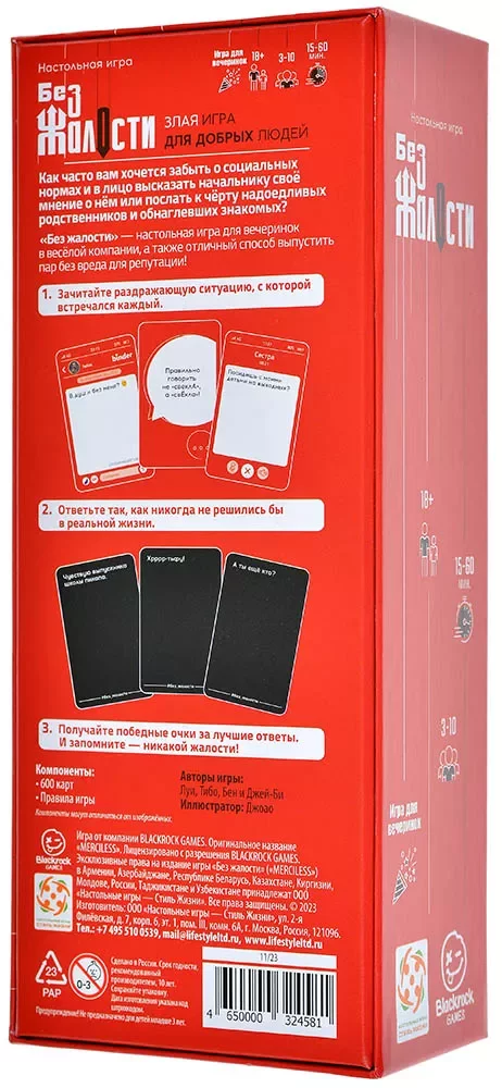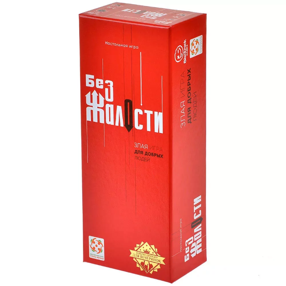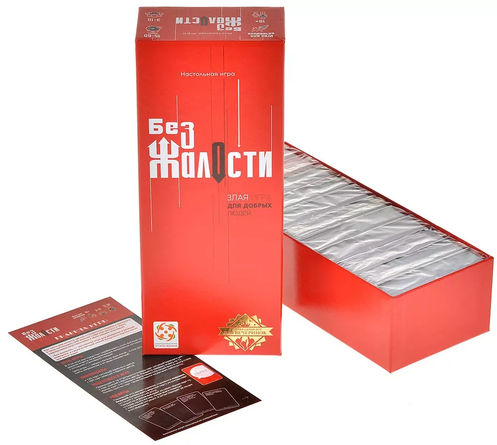 "Без жалости" – идеальная вечериночная настолка, которая подарит массу смеха в компании друзей и поможет выпустить пар без каких-либо последствий для собственной репутации! В основе игры лежат реакции игроков на самые обыденные ситуации, происходящие в жизни каждого: надоедливые звонки, пустые разговоры, раздражающие соседи... Комбинации большого количества ситуаций (целых 120) и ещё большего количества реакций (480, вы только вдумайтесь!) будут создавать совершенно различные и, казалось бы, невозможные ситуации, которые точно вызовут у вас смех. Веселье в большой компании гарантировано!