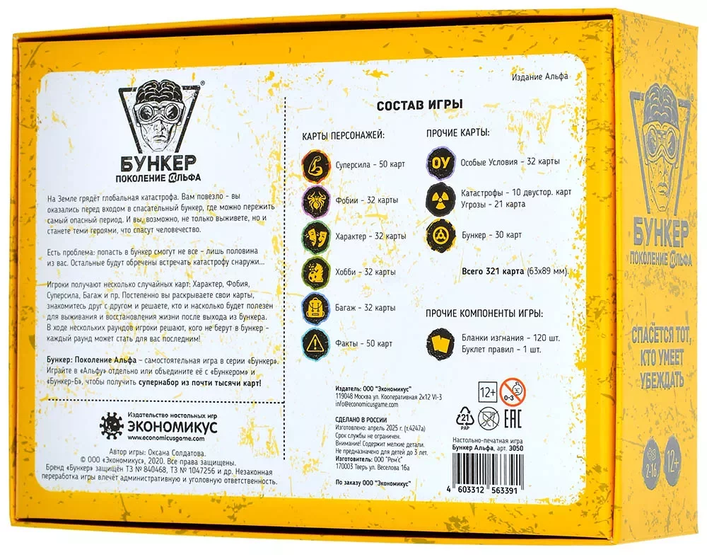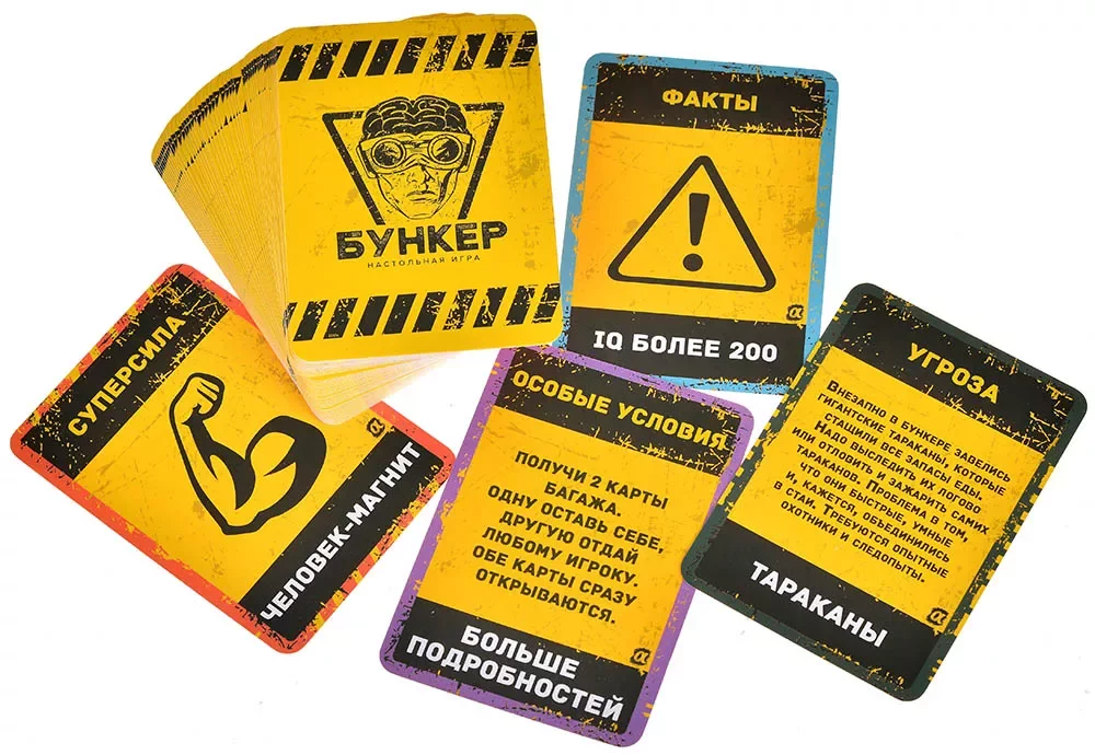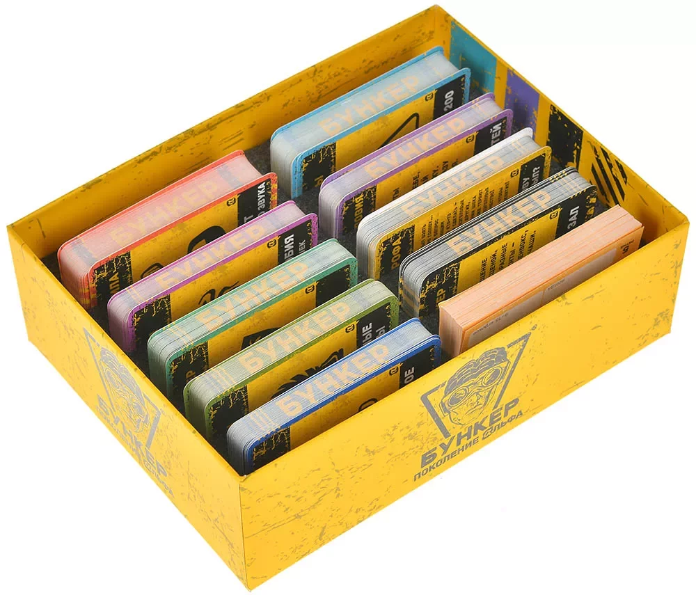 Что делает эту версию особенной? Во-первых, три абсолютно новых колоды: "Суперсила" – где можно оказаться кем угодно, от повелителя снов до человека, умеющего открывать любую банку одним взглядом. "Фобия" – потому что бояться можно не только пауков, но и, скажем, внезапного исчезновения вайфая. И "Характер" – где ваши недостатки внезапно могут стать главным аргументом за ваше спасение. А ещё теперь вас будут ждать совершенно новые испытания, хобби и багаж – в общем, обновитесь по полной! Впрочем, если захотите смешать это издание с предыдущими коробками из серии "Бункер", не останавливайте себя – так будет ещё веселее.
