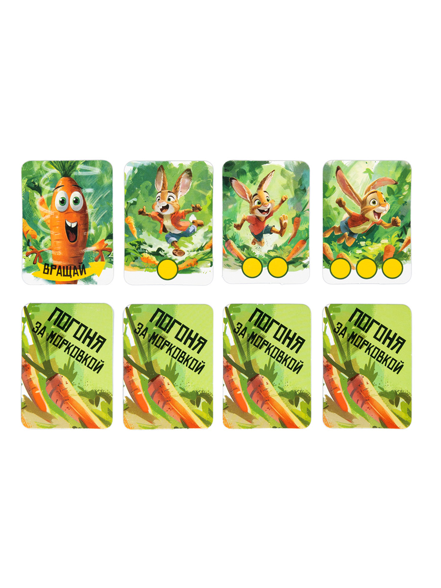 - Когда кролик добирается до грядки, игрок начинает тянуть карточки. Если выпал кролик — шагайте вперед. Если морковка — крутите большую морковку в центре!