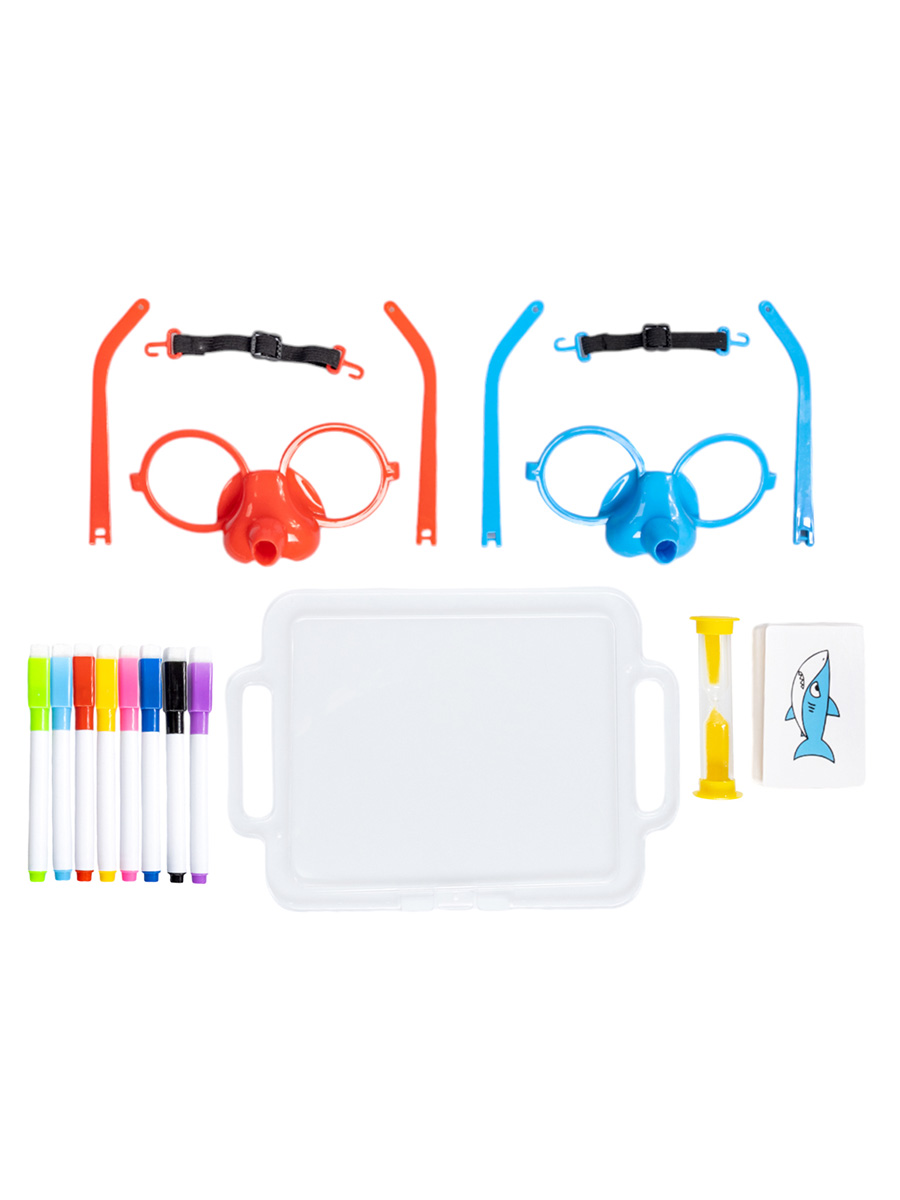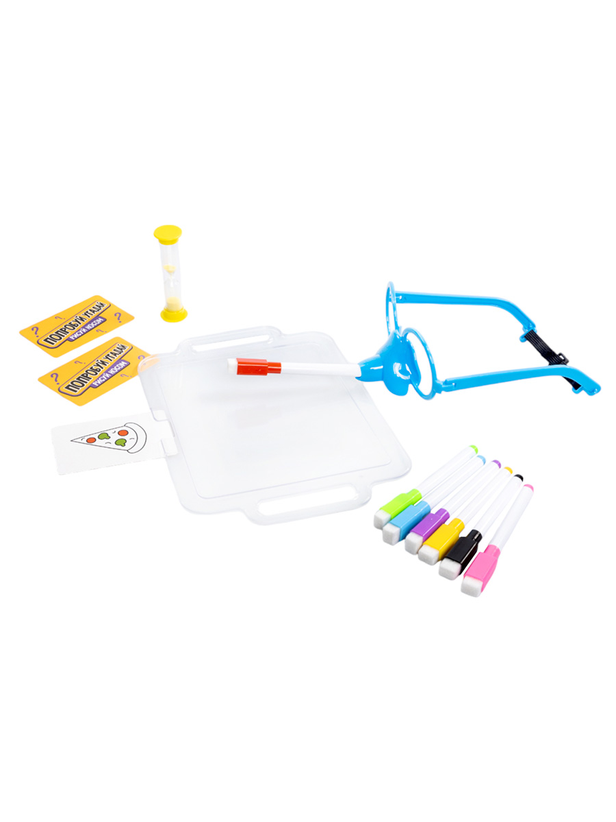 маска 2 шт, заушники 4 шт, резинка-держатель 2 шт, цветные маркеры 8 шт, песочные часы, карты с заданиями 54 шт, доска для рисования 17 х 24 см