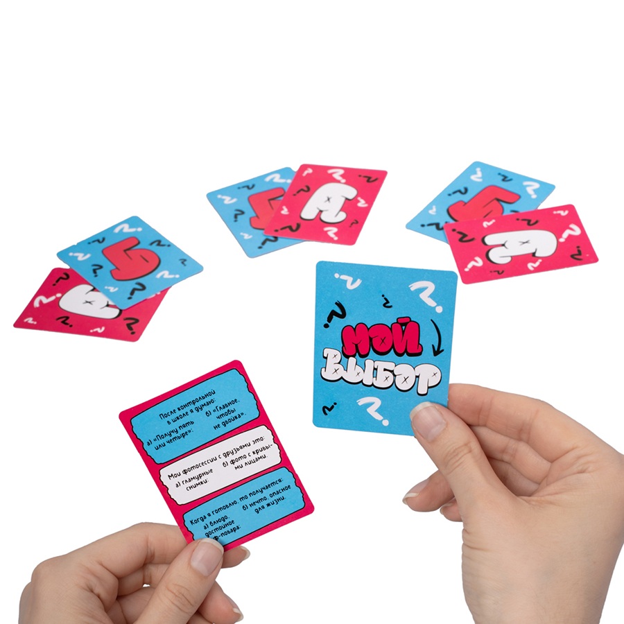 - Ведущий тянет карточку и зачитывает вопросы (по три на каждой карте).