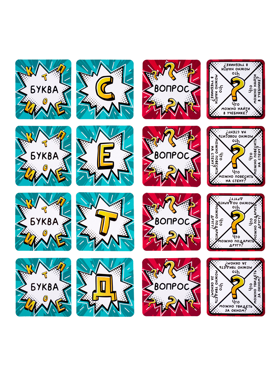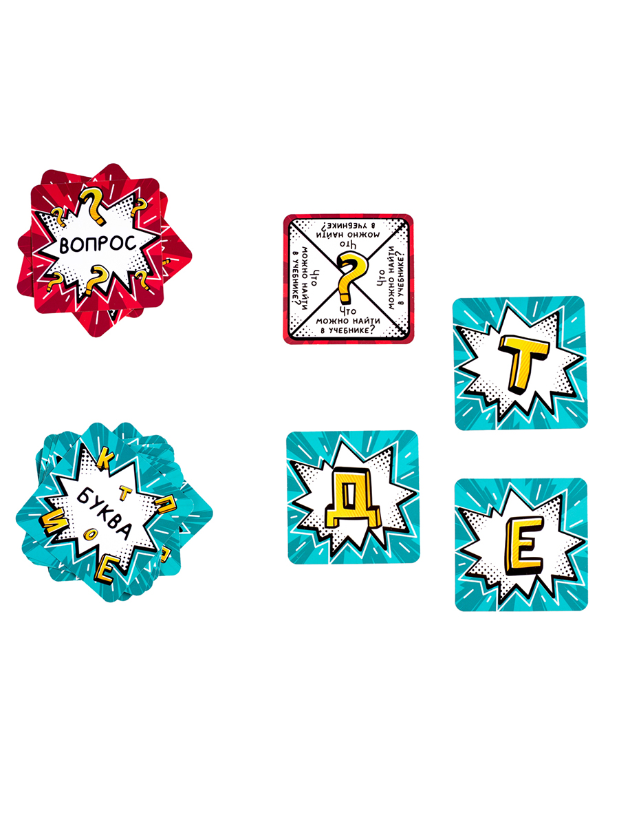 карточки вопросы 6.5 х 6.5 см – 69 шт, карточки буквы 6.5 х 6.5 см – 27 шт и правила игры