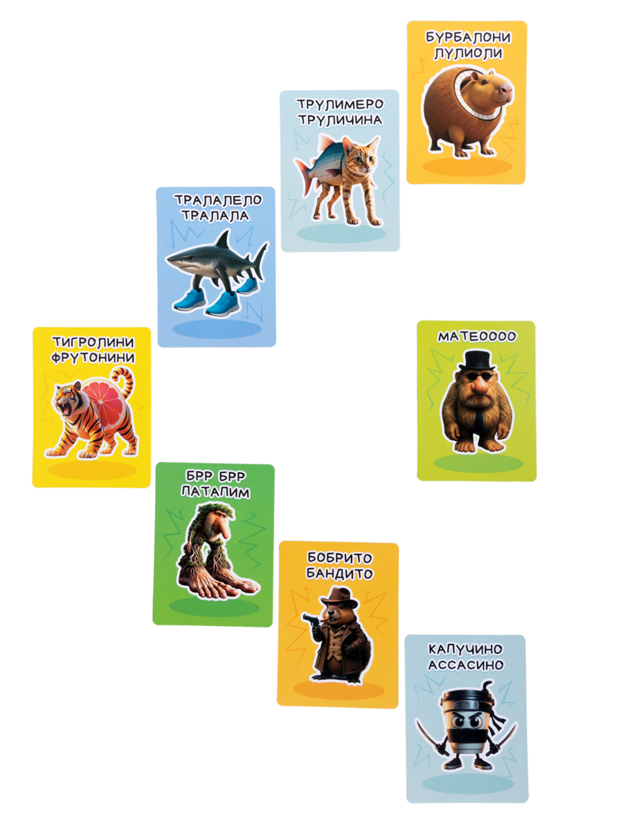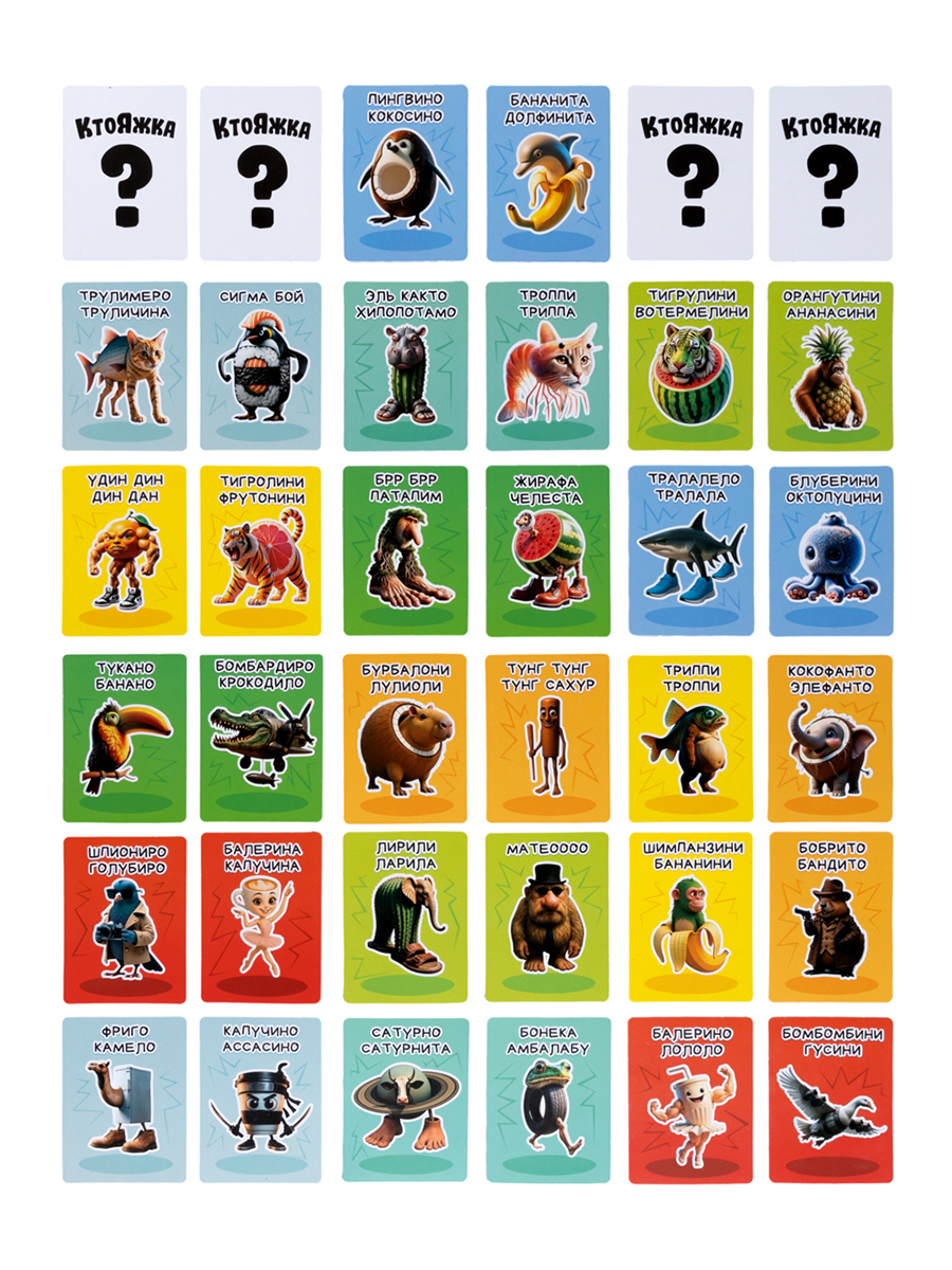Набор вдохновлен узнаваемыми мемами, которые подарят вам массу удовольствия. Станьте бобрито-бандито или балериной-капучиной и выясните, кем вы являетесь, задавая наводящие вопросы друзьям.