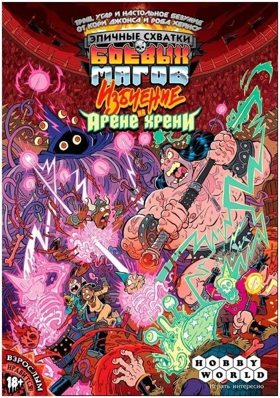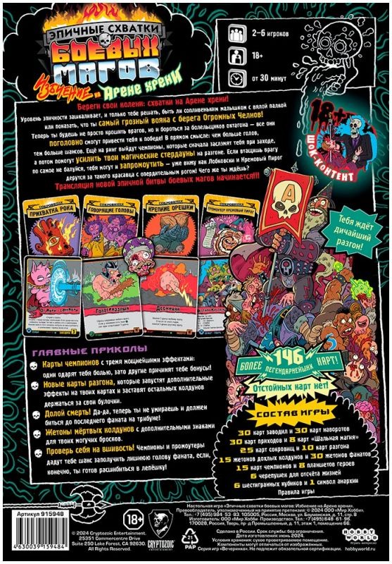 Каждый новый выпуск "Эпичных схваток боевых магов" – это настоящий праздник для всех любителей и профессионалов бить лица волшебством. И "Избиение на Арене хрени" не стало исключением. Как уже заведено у нас магов, новая коробка – новые карты заклинаний. Но не одними заводилами, наворотами и приходами будем сыты! Какая арена без чемпионов? И тут они есть! Их карты обладают тремя ультрамегамощными эффектами, которые подарят вам радость боли и страдания пользы. А ещё теперь вы бессмертны! Да-да, долой эту старую каргу с косой, теперь у вас другая мотивация – битва до последнего фаната на вашей трибуне! Но жетоны дохлых колдунов никуда не делись, просто теперь они получили дополнительные знаки, чтобы сделать ваши броски кубов более могучими. Чего вы ещё ждёте? Не тяните фамильяра за гримуар, отправляйтесь на арену сейчас же!