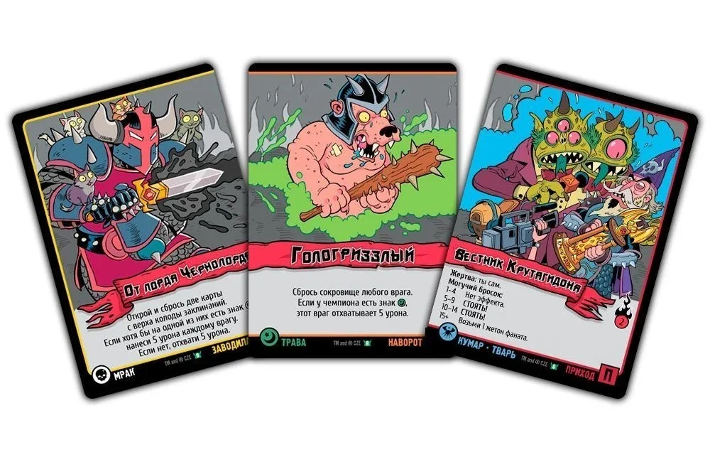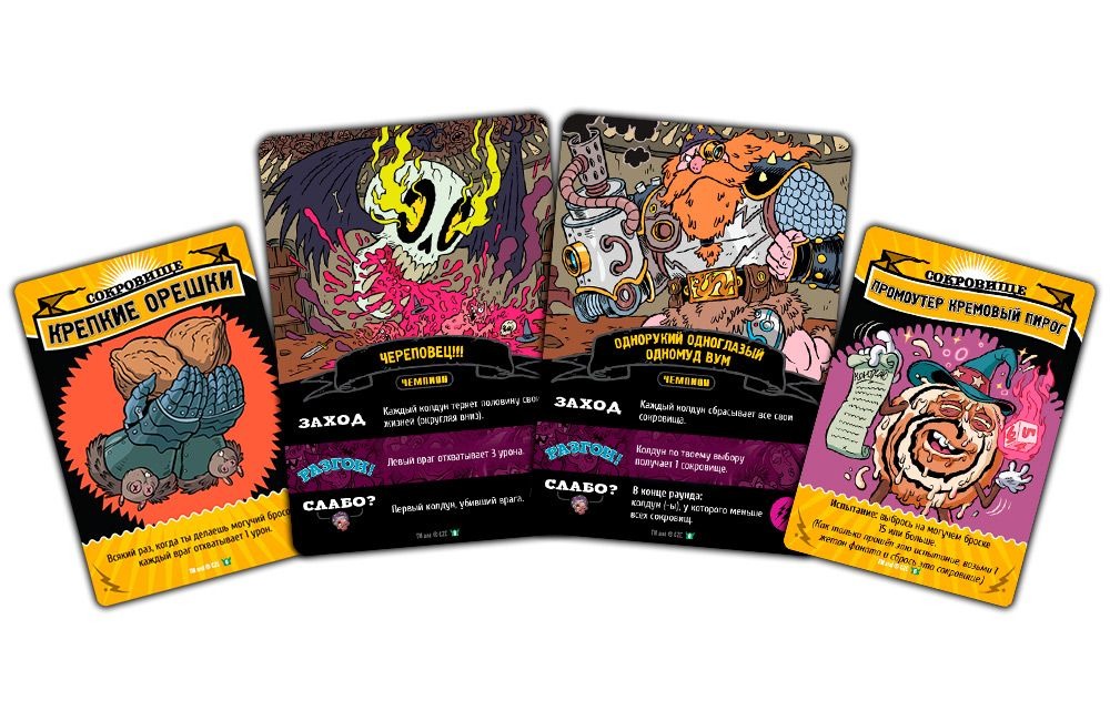 - Применяем все эффекты заклинания – эффекты карт применяются по порядку, как выложены карты – сначала Заводила, потом Наворот и затем Приход. Если карта потребует сделать Могучий бросок, то вам нужно будет бросить по одном кубику за каждую карту в заклинании с таким знаком. Всего знаков, то есть школ магии пять: Порча, Мрак, Угар, Кумар, Трава. Все маги в своём порядке применяют эффекты карт и наносят друг другу повреждения