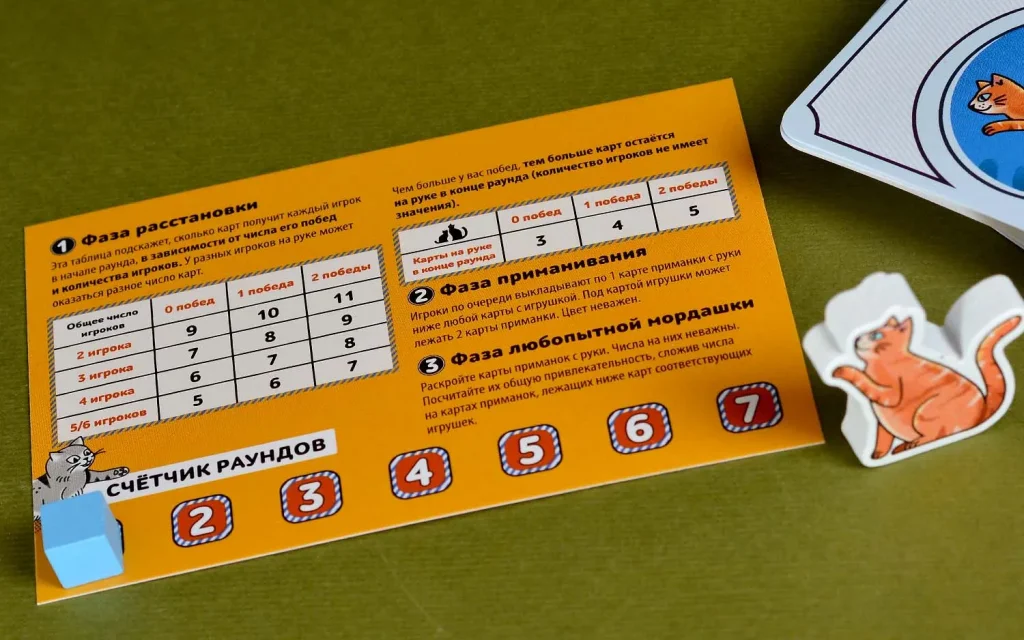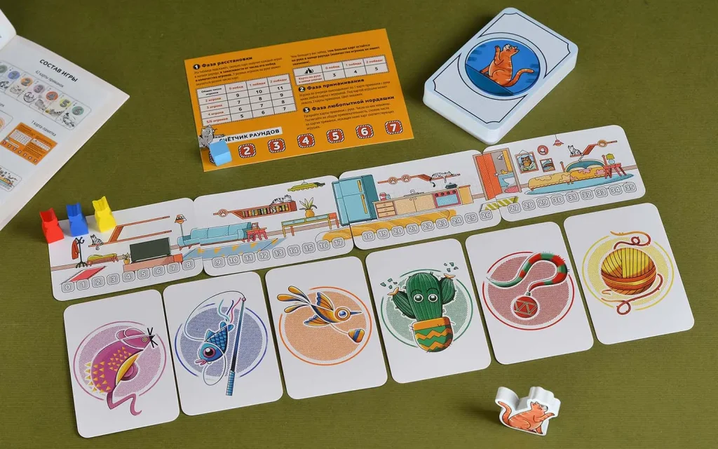 Затем начинается фаза приманивания: по очереди игроки выкладывают карты приманок под игрушки, повышая их привлекательность и стараясь запутать соперников.