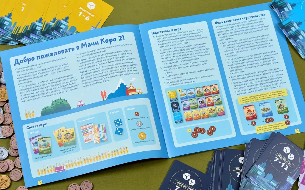"Мачи Коро 2" – это градостроительная настольная игра для всей семьи, в которой вам предстоит взять на себя роль не абы кого, а самого мэра! Каждый из вас старается привлечь в свой город как можно больше туристов, а ничто не привлекает их лучше, чем достопримечательности: именно в их строительстве вы и будете соревноваться. Однако строительство чего-то примечательного стоит дорого, поэтому надо сначала пополнить казну: стройте в своём городе промышленные предприятия, магазины, рынки, кафе и рестораны, которые будут приносить вам доход в виде приятных пластиковых монеток! Подойдите к делу с умом, и успех не заставит себя долго ждать!
