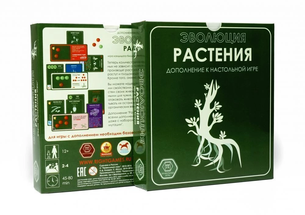 "Эволюция. Растения" – третье дополнение к научно-популярной игре "Эволюция". Это дополнение совместимо со всеми играми и дополнениями серии. В правилах описываются важные моменты по взаимодействию "Растений" и других игр серии "Эволюция".