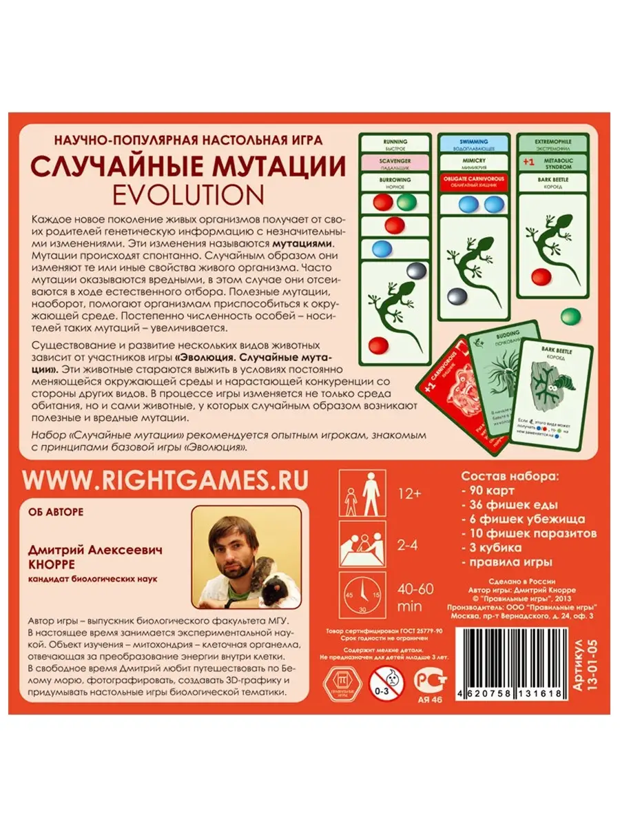 Настольная игра "Эволюция" – это уникальная игра для 2-4 человек, созданная кандидатом биологических наук Дмитрием Алексеевичем Кнорре. Она основана на реально существующих и функционирующих экосистемах и поможет вашему ребёнку в игровой форме понять такой сложный и длительный процесс, как эволюция, и даже поучаствовать в нём! Игра также будет интересна и взрослым, ведь вы сможете создать свою собственную ветвь эволюции и посмотреть, как живые существа приживутся и адаптируются в уже существующих условиях. Создавайте, эволюционируйте и развивайте!